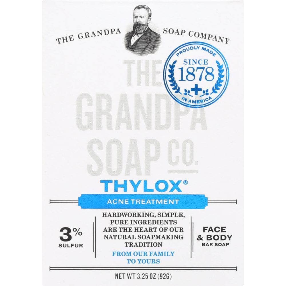 Grandpa’s Thylox soap is a sulfur-based cleanser for acne prone skin. Thylox helps eliminate blackheads and breakouts, keeps pores clog-free, and effectively removes excess oil. For over 50 years, Thylox has proven that acne treatment doesn’t have to be expensive to be effective. Grandpa’s Thylox soap is over 99% natural. 3.25 oz
