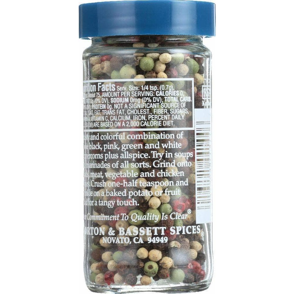 A tasty and colorful combination of whole black, pink, green and white peppercorns plus allspice. Try in soups and marinades of all sorts. Grind onto salads, meat, vegetable and chicken dishes. Crush one-half teaspon and sprinkle on a baked potato or fruit salad for a tangy touch.