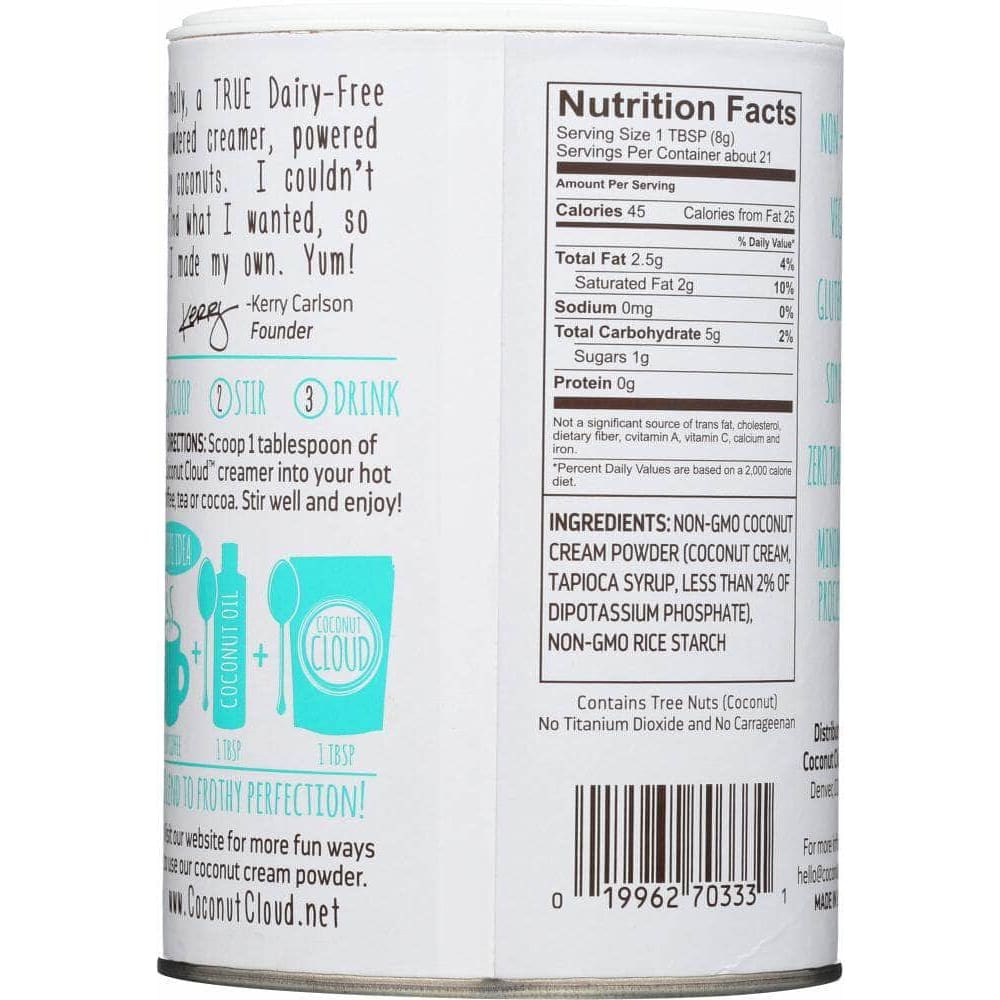 Discover the wholesome goodness of coconuts with our 100% dairy-free Coconut Cloud Original! Made from sustainably harvested coconuts and packed with energizing MCT oil powder, this creamer is the ultimate choice to elevate your morning cup of joe. Whether you're a dairy-free devotee or trying to be a more conscientious consumer, you're sure to love the light and delicious taste of Coconut Cloud Original!