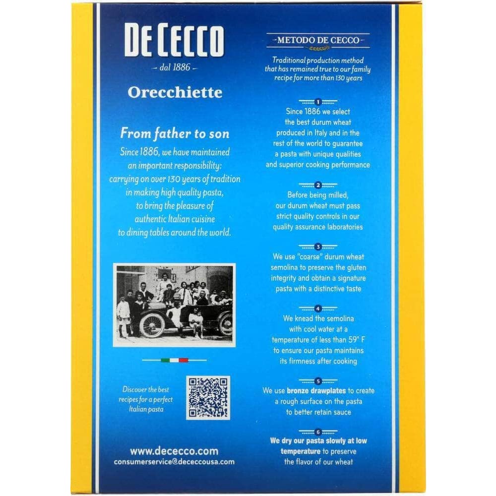 As time goes by things change, but the De Cecco brand today is still synonymous for premium quality in the pasta world. There has been no change in the will to pass on, safeguard and consolidate the Founder’s original principles of production and quality: selected wheat, fresh semolina from the Molino, bronze plate drawing, low temperature drying and constant quality control. Every De Cecco act, today, like back then, comes from deep passion and tenacious search for perfection starting from pasta and going forward.