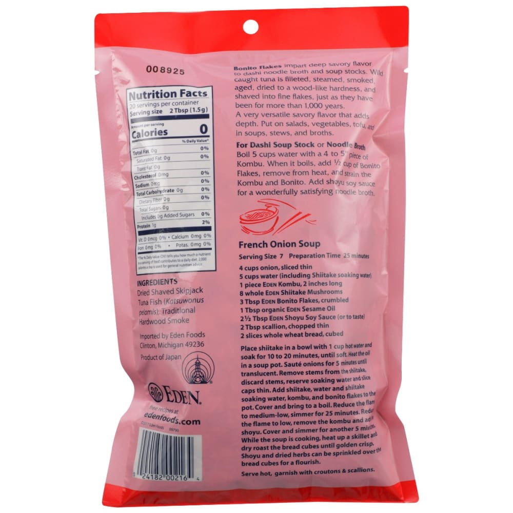 Bonito (pronounced Bo NEE toe) has been a staple in the Japanese diet for centuries. According to the School of Marine Sciences at the University of Miami, the scientific name of bonito or skipjack tuna is Katsuwonus pelamis. In Japan, it is known as katsuo.About 500 years ago it was discovered that proper drying could preserve bonito so that it could be stored indefinitely in a cool, dry, and dark environment. EDEN Bonito Flakes still employ this ancient manner of careful preparation. First, the best quality bonito fillets are steamed and hung outside in the shade to air dry. The fillets are then brought inside and stored in a dark room. They are removed and placed outside to dry again. The storing and drying process is repeated three times. When completely dry, the fillets become hard and resemble hardwood. To produce bonito flakes or 'katsuo boshi', the hard fillets are shaved over a knifed box that looks much like a carpenter's plane. Shaving the bonito produces long, pinkish-tan curls or flakes. The flakes are then packed and shipped to Eden.EDEN Bonito Flakes are made from the best quality authentic skipjack tuna fillets. The Japanese judge the quality of fish by whether it can be eaten raw as sashimi. The real bonito or 'katsuo' used in EDEN Bonito Flakes is of sashimi quality. Many commercial producers sell bonito flakes made from bullet mackerel or bullet tuna called 'soda katsuo'. It's cheaper and not considered sashimi quality. EDEN Bonito Flakes are made in the traditional manner that has been used for 500 years. No artificial coloring agents, chemicals, or preservatives are used in any stage of their production.Bonito flakes are used to create a variety of soup stocks called 'dashi'. The stock is strained to remove the tough fibrous flakes and used to create a variety of delicious and nourishing soups, stews, and sauces. EDEN Bonito Flakes are quick and easy to use to prepare a variety of soup stocks. Simply bring 5 cups of water to a boil, add a half cup of bonito flakes and immediately remove from the flame. Strain out the bonito flakes and discard. Ingredients such as kombu, shiitake mushroom, and vegetables can be added to bonito stock to create variety in flavor and nutrition. Bonito stock is especially delicious when used to make hardy miso soup, noodle broth, or French onion soup. It is also delicious in scalloped potatoes and baked beans instead of meat, giving the dish a delightful smoked flavor - not fishy at all. It can also be used to create dip sauces and gravies. Bonito also makes an excellent topping for pizza (broil briefly to crisp, a tasty condiment).