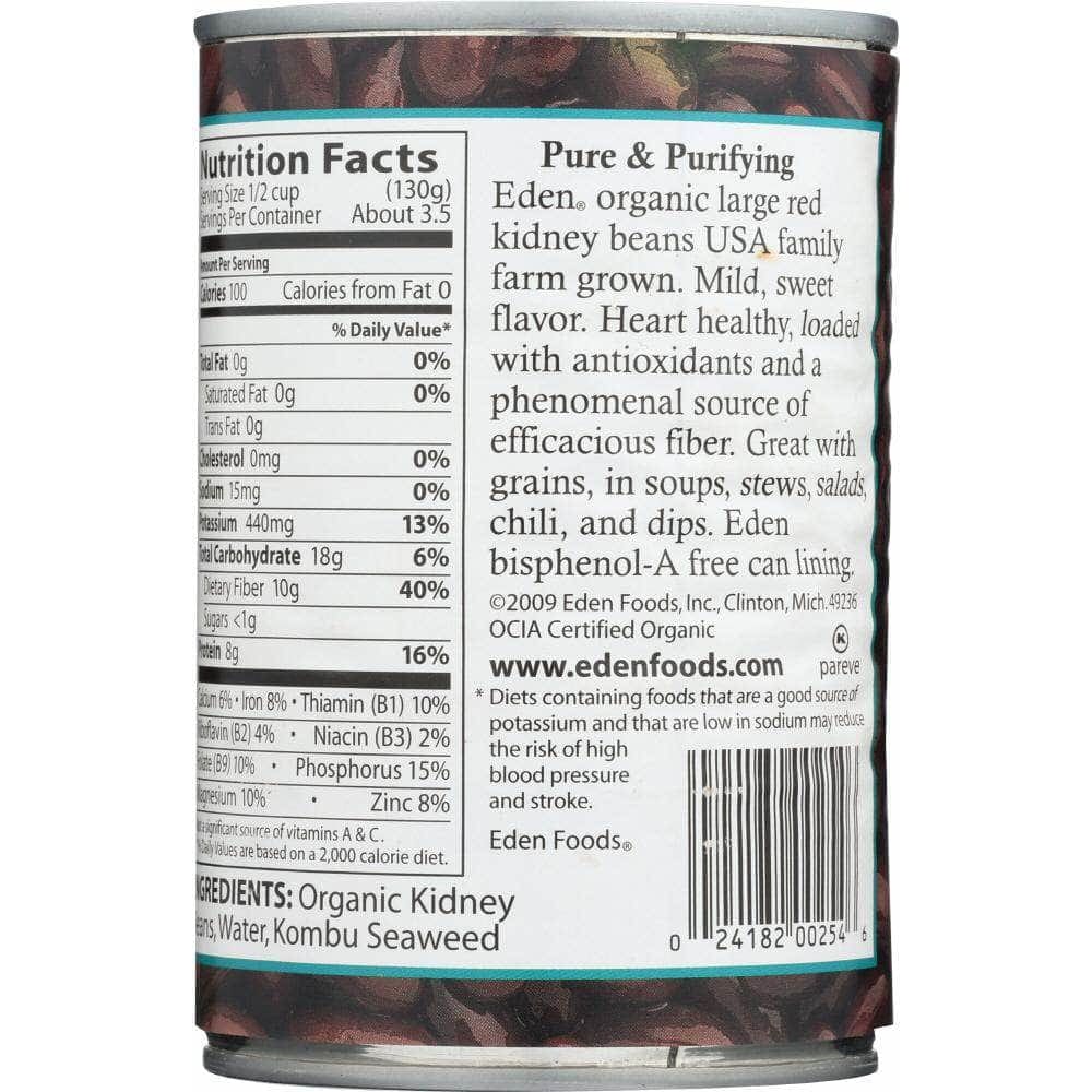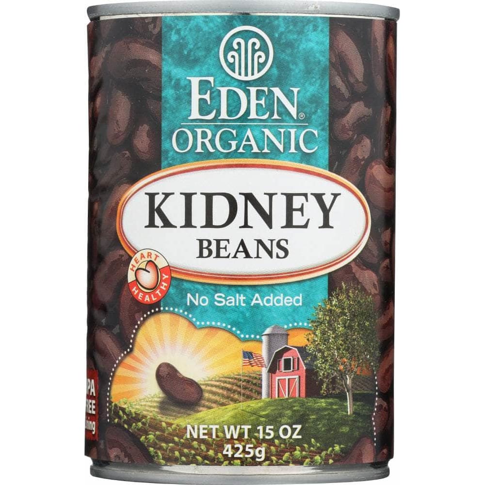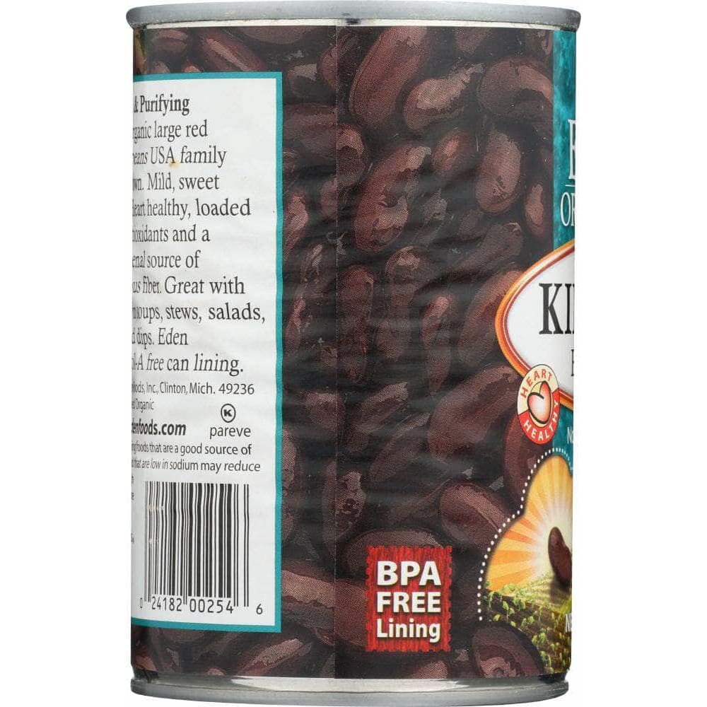 Organic U.S.A. family farm large red kidney beans soaked overnight and thoroughly cooked at Eden's certified organic and kosher cannery with purified water and zero chemical additives. Great in soups, stews, salads, chili, refried beans, dips, and with all whole grain. A phenomenal source of healthy fiber, 40 percent daily value per serving, plus a good source of potassium, protein, thiamin B1, folate B9, and magnesium. No salt added. Packed in bisphenol-A (BPA) free can linings since April 1999.