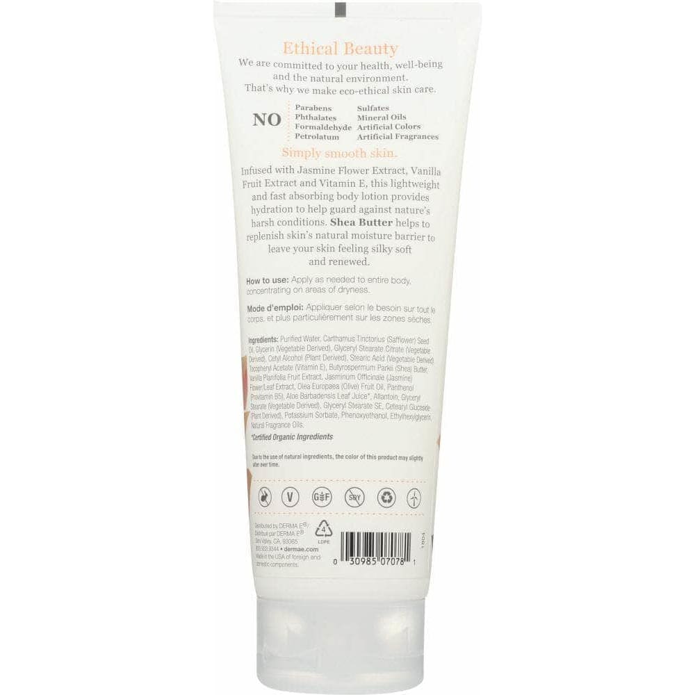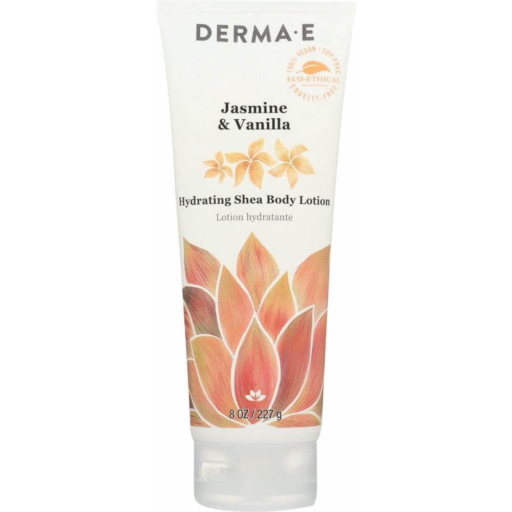 DERMA E's Jasmine & Vanilla Hydrating Shea Body Lotion helps to hydrate skin while helping to guard against natures harsh conditions. Pleasantly scented with a blend of natural fragrance oils including natural Jasmine and Vanilla.