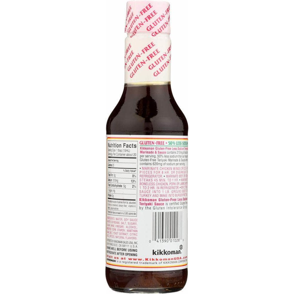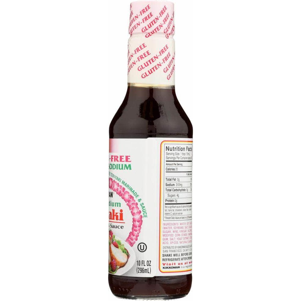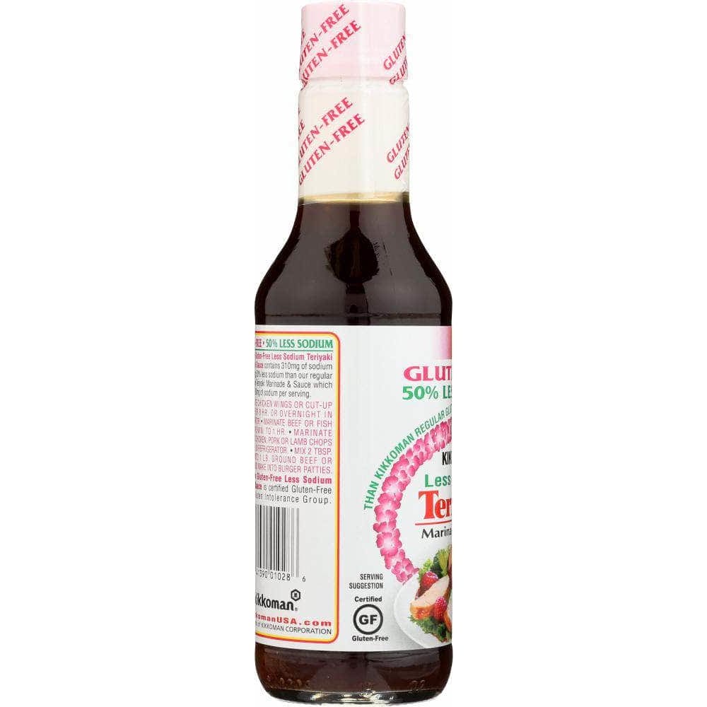 Kikkoman 50% Less Sodium Gluten-Free Teriyaki Marinade & Sauce is a premium teriyaki sauce that contains 50% less sodium than Kikkoman Gluten-Free Teriyaki Marinade & Sauce while maintaining the same rich, savory flavor and taste. Made using traditionally brewed soy sauce with four simple ingredients – water, soybeans, salt and sugar, it is certified gluten-free by the Gluten Intolerance Group (GIG).