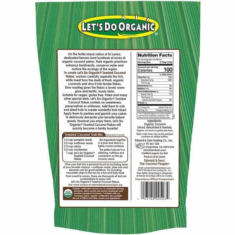 To create Let's Do Organic Toasted Coconut Flakes, the rich, white meat of fresh organic coconuts is manually separated from their shells and sliced into tender flakes. Slow roasting gives them a warm glow and toasty taste. This product is 100% organic coconut flakes with nothing else added โ no sweeteners, preservatives, whiteners, or sulfites. Deliciously decorate cakes or pastries, add them to your favorite nuts and dried fruits to make wonderful trail mixes, top aรงaรญ bowls or smoothies, munch on them right out of the bag, how ever you enjoy them they are sure to be a favorite!