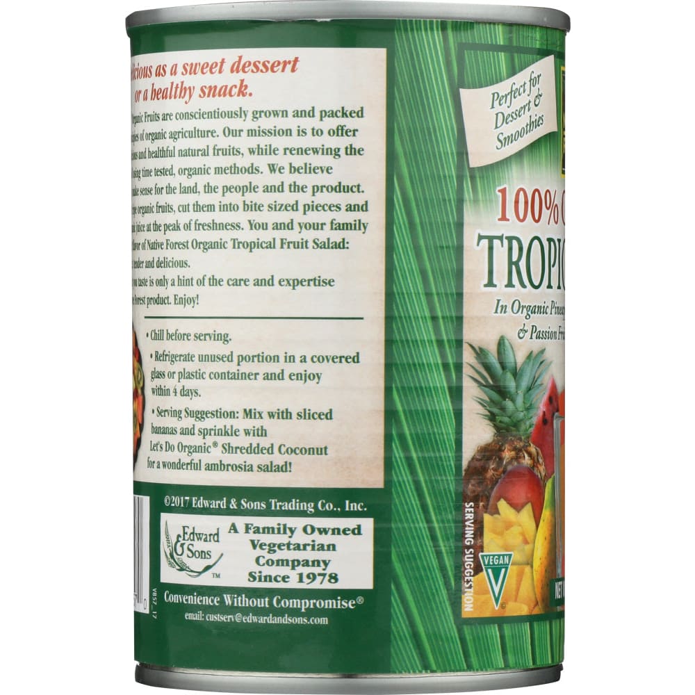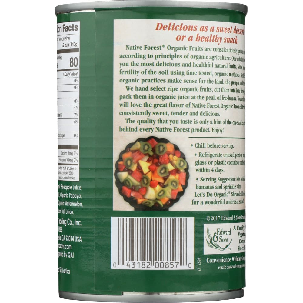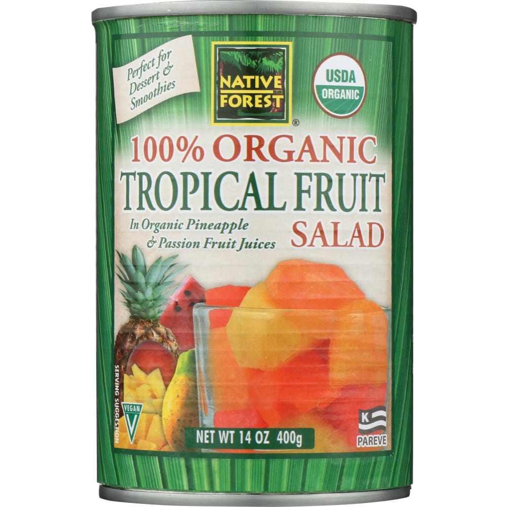 Delicious as a sweet dessert or a healthy snack.Native Forest Organic Fruits are conscientiously grown and packed according to priciples of organic agriculture. Our mission is to offer you the most delicious and healthful natural fruits, while renewing the believe fertility of the soil using time tested, organic methods. We believe organic practices make sense for the land, the people and the product.We hand select ripe organic fruits, cut them into bite sized pieces and pack them in organic juice at the peak of freshness. You and your family will love the great flavor of Native Forest Organic Tropical Fruit Salad: consistently sweet, tender and delicious.The quality that you taste is only a hint of the care and expertise behind every Native Forest product. Enjoy!