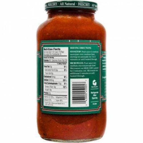 Create delicious Italian dishes with Frescorti Pasta Sauce Marinara. It is a premium recipe made with 100 percent natural ingredients. The Frescorti marinara sauce contains a blend of garlic, black pepper, oregano and basil. It is ideal to serve with spaghetti and other kinds of pasta and can also be used for dipping. The sauce is easy to prepare and can be heated in a microwave or on a stovetop. It is also suitable for vegetarian and kosher diets.