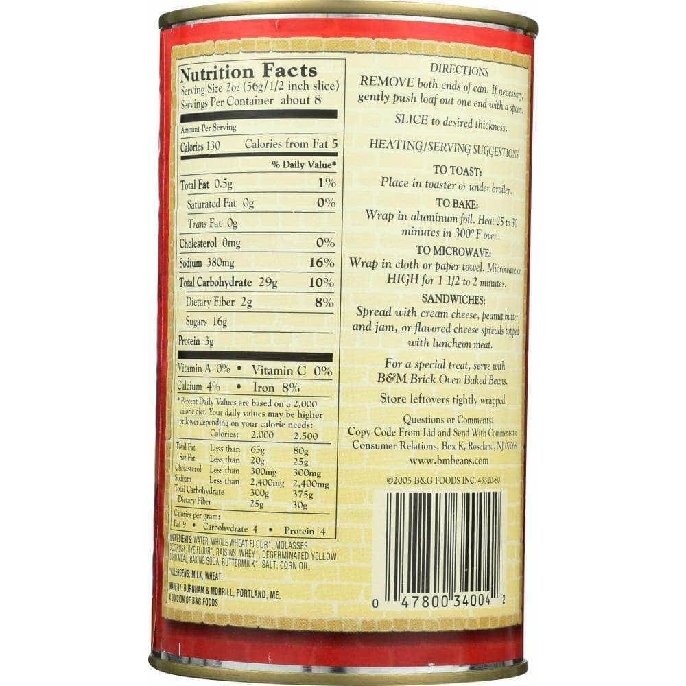 B&M brown bread can be baked in the oven, toasted, broiled or microwaved. Serve it with creamed cheese, peanut butter and jam or with luncheon meat and your favorite spread. This sumptuous raisin bread also couples well with B&M Brick Oven Baked Beans. This product is 99% fat free and contains no cholesterol.