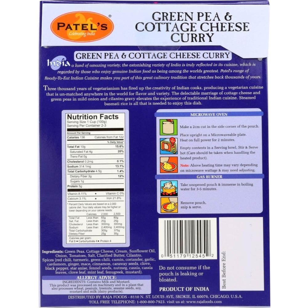 Mutter paneer. Peas & cottage cheese in spiced sauce. Celebrating India. All natural. No preservatives. Microwave for 2 minutes in pouch. 100% vegetarian. India is a land of amazing variety, the astonishing variety of India is truly reflected in its cuisine, which is regarded by those who enjoy genuine Indian food as being among the worlds greatest. Patel's range of ready-to-eat Indian cuisine makes you part of this great culinary tradition that stretches back thousands of years. Three thousand years of vegetarianism has fired up the creativity of Indian cooks, producing a vegetarian cuisine that is un-matched anywhere in the world for flavor and variety.