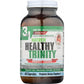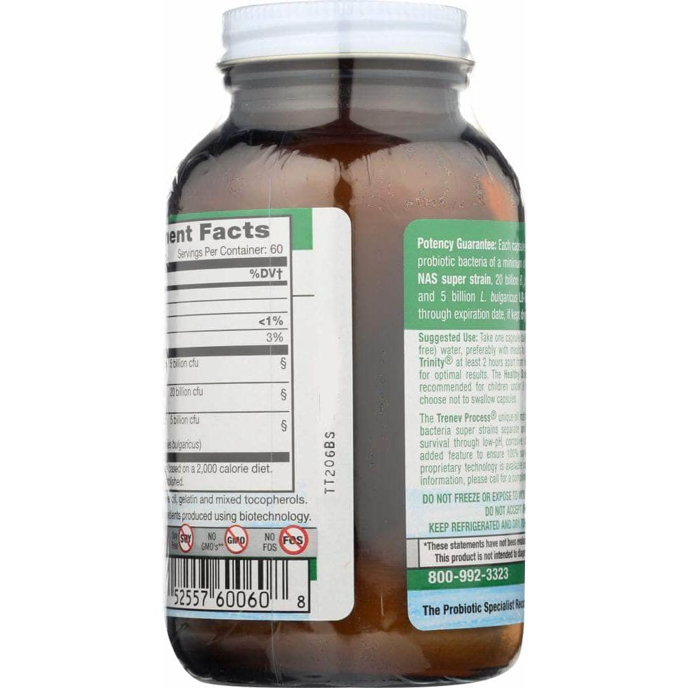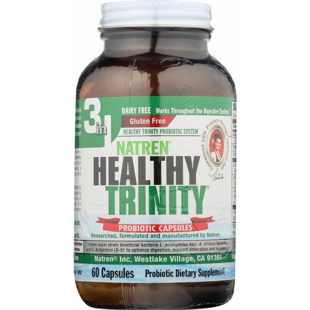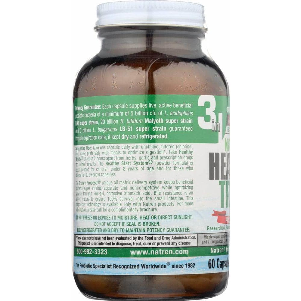 HEALTHY TRINITY This amazing three-in-one probiotic supplement is our most potent and popular product. Each non-dairy probiotic capsule contains a minimum of 30 billion colony forming units (cfu) of three potent, super strains of beneficial bacteria. Natren's Healthy Trinity uses only bacteria super strains developed through years of research. These bacteria strains have proven to be the most beneficial for specific regions or functions of the gastrointestinal tract. Our unique proprietary Trenev Process ensures unmatched survivability and stability of the live bacteria. This cutting-edge technology uses an oil-matrix system to micro-enrobe each of these three super strains of beneficial bacteria to keep them separated, noncompetitive and virtually 100% protected from the stomach's gastric juices.** **The survivability is Independent third party tested in vitro by an internationally acclaimed European institute. Healthy Trinity's bile-resistant super strains are then released directly into the small intestine in the next stage of digestion, when bile breaks down the oil carrier and allows the beneficial bacteria to disperse through the gastrointestinal tract. A gastrointestinal problem such as occasional irregularity or minor indigestion can undermine your health. Natren Healthy Trinityยฎ probiotics may be the answer for you! Healthy Trinity is recommended for adults and children over eight years of age. Children eight years old and younger should take probiotic powders or chewable probiotics to avoid possible choking hazards from swallowing probiotic capsules. 100% potency guaranteed through the printed expiration date when stored under the conditions on the label.