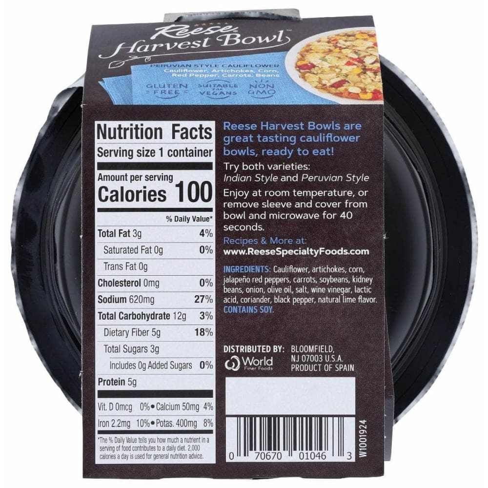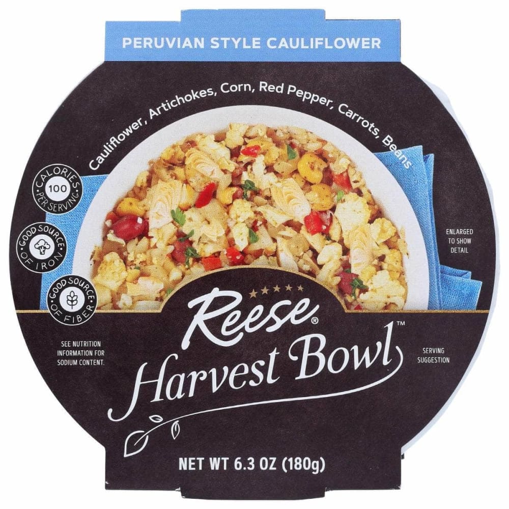 Reese introduces Harvest Bowls, flavorful grain bowls which are ready to eat, just open and enjoy! The Peruvian-Style Cauliflower Harvest Bowl is a delicious combination of cauliflower, artichokes, corn, peppers, carrots and beans.