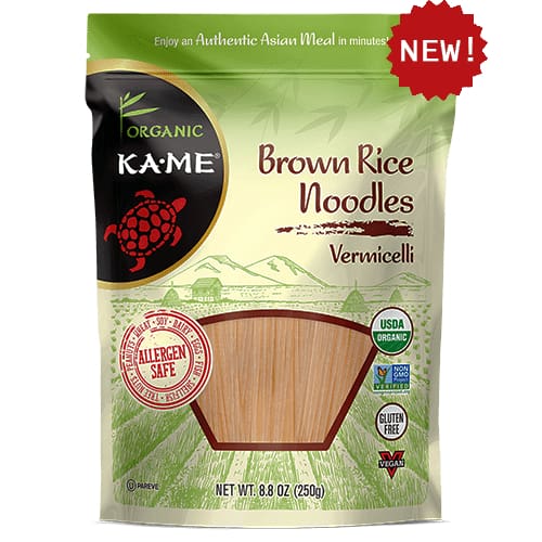 KA•ME Organic Rice Noodles, premium quality, grown and harvested on an organic farm in Thailand and naturally gluten free. It is a traditional ingredient, versatile in many Thai and Southeast Asian recipes and perfect served hot or cold added to stir-fries, soups and salads.