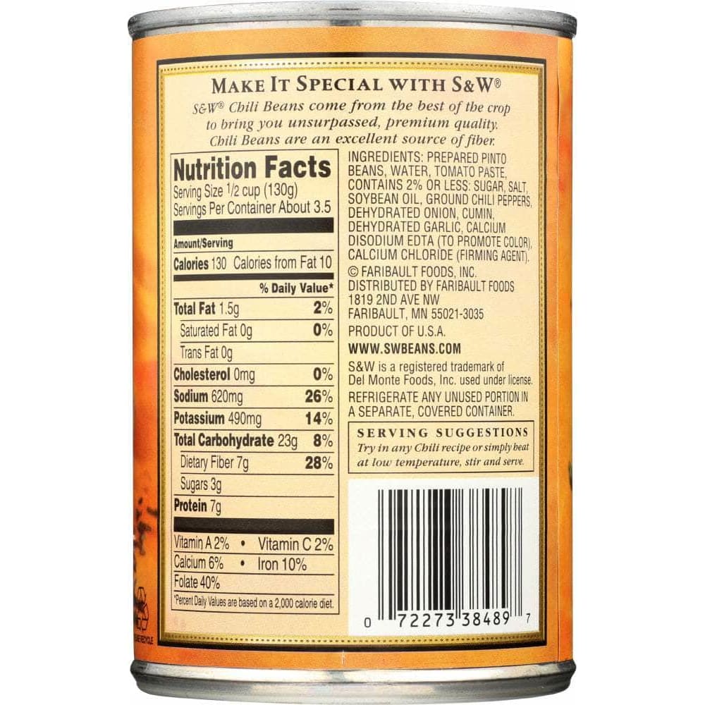 S&W Chili Beans come from the best of the crop to bring you unsurpassed, premium quality. Chili Beans are an excellent source of fiber.