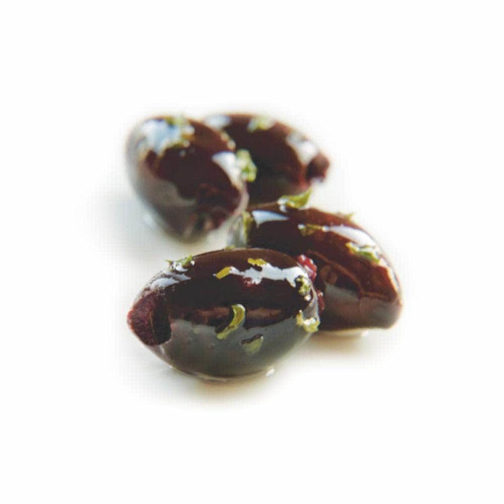 DeLallo Jumbo Seasoned Calamata Olives are prized Greek olives with a distinct purple hue and almond shape, boasting a complex tart and smoky flavor with a semi-firm texture and meaty bite. Pitted and seasoned with select herbs and spices for easy gourmet snacking and entertaining.