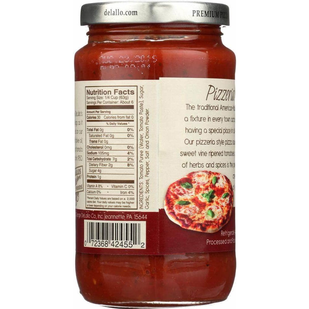 DeLallo Pizzeria-Style Pizza Sauce is an authentic Italian recipe featuring the rich, vibrant flavor of red-ripe Roma tomatoes in a subtle blend of complementary spices. - Authentic Italian recipe. - Crafted with red-ripe California Roma tomatoes. - Rich tomato flavor accented with a subtle medley of herbs and spices. - Quick and easy pizza sauce straight from the jar.