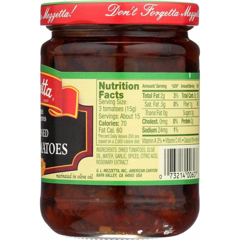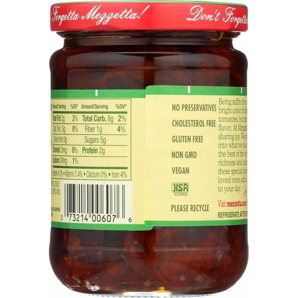 Mezzetta Sun-Dried Tomatoes in Olive Oil are made with farm fresh California ripe tomatoes. Dried whole under the California sun, they are packed with fresh herbs and olive oil. Their soft velvety texture and deep rich flavor is a must for delicious appetizers, pasta salads, sandwiches, pizza and pasta.