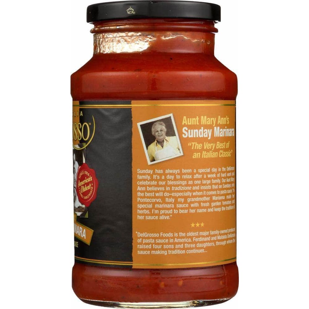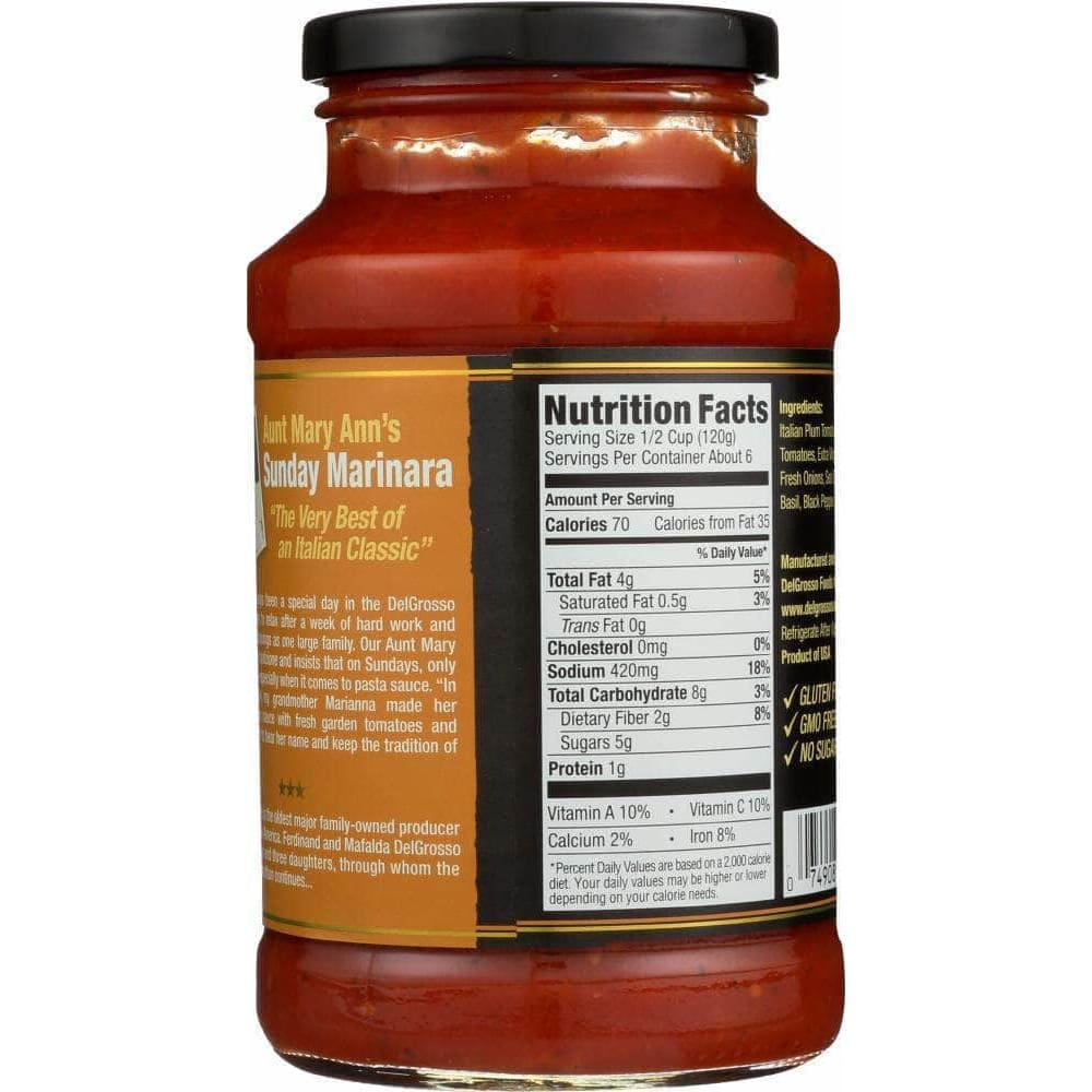 Bring the classic taste of sweet marinara to your dining table with this Marinara Pasta Sauce from La Famiglia Del Grosso™ Aunt Mary Ann's®. Whether you're cooking up chicken parmesan or a light pasta dish, you'll love simmering up this sauce to finish things off. Fresh tomatoes lend the vibrant red color and sweet flavor to the sauce, while fresh onions, sea salt, garlic, basil, black pepper and parsley tie it all together.