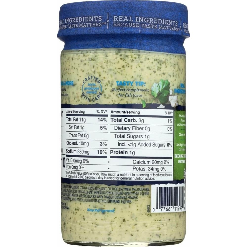 Our premium blend of Cotija cheese and cilantro together make a full flavor dressing filled with quality ingredients. Pieces of cilantro leaves combined with the robust Cotija cheese add a refreshing taste complementing any taco, salad, or taco salad, quite well. Tasty Tip: Perfect complement for fish tacos!
