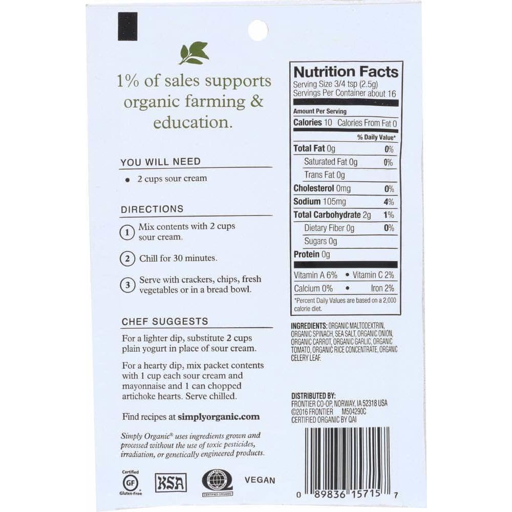 Use Simply Organic® Spinach Dip Mix for a quick, cool, and creamy dip. Add our organic seasoning mix, featuring spinach, garlic, carrot, and tomato powder, to sour cream or plain yogurt to whip up a tasty spinach dip in minutes.
