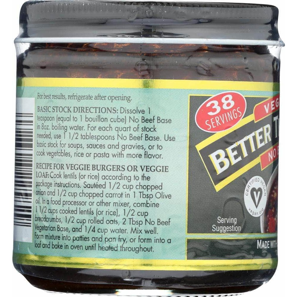 Vegetarian Better Than Bouillon No Beef Base is Certified Vegan beef flavor, which can be used in soups, gravies and stocks. Better Than Bouillon blendable bases easily spoon right out of the jar and let you add as much, or as little, flavor as desired.