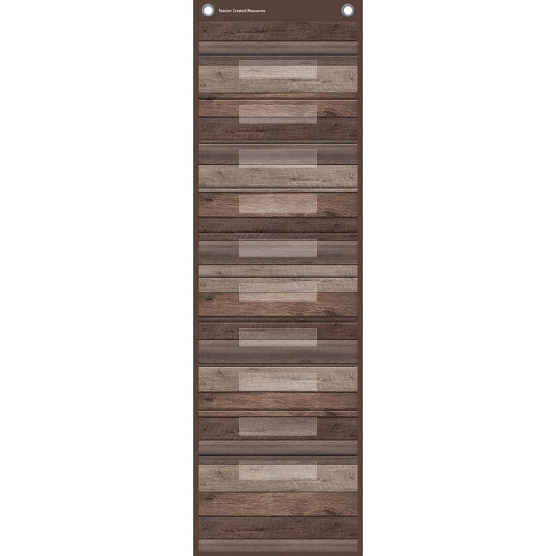 This lightweight and durable Dark Wood pocket chart features a rustic design and hangs easily from sturdy, metal grommets. 10 folder-sized pockets. Clear label holders. The non-porous surface is easy to clean and can be wiped-down or sprayed with disinfectant to help prevent the spread of germs. Measures 14" x 58".