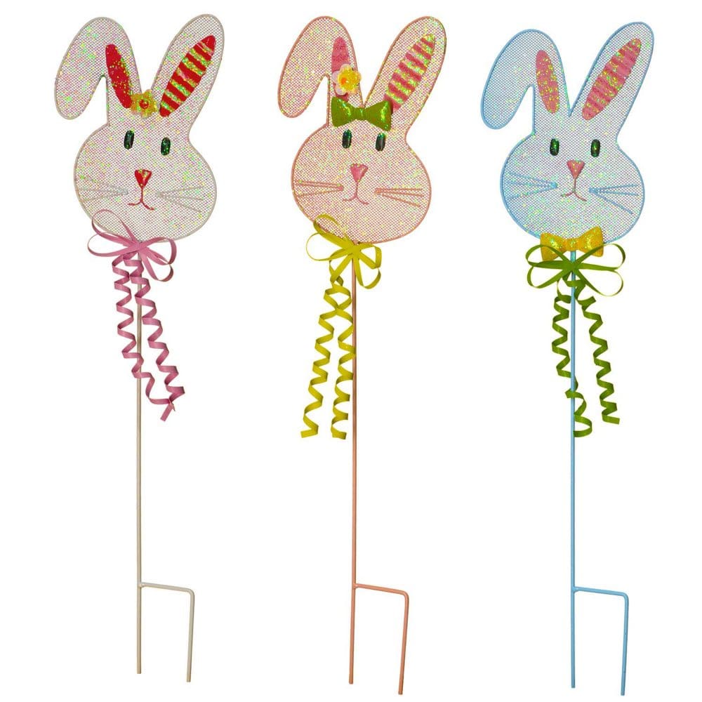 Celebrate the Easter holiday and spring season with these cute and colorful 24" Metal Easter Bunny Garden Stakes. Each piece is constructed of painted metal components featuring a glittered wire mesh face in white, pink and blue, with curling ribbon bow ties. Sturdy steel stakes provide easy display in garden or yard areas around the home.