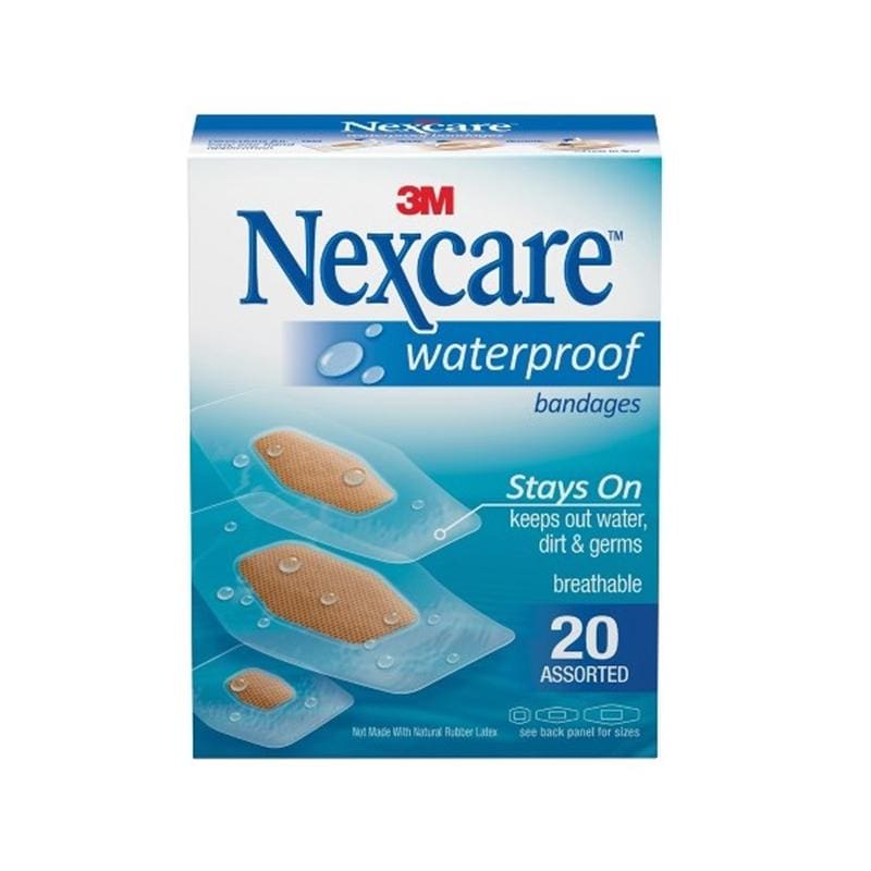 Nexcare Waterproof Bandages are designed to stay on in wet conditions, keeping water out. Use to protect minor wounds such as scrapes, cuts and blisters. The ultra-thin, breathable construction has a 360 degree seal to protect against water, dirt and germs, helping to prevent infection. The clear, flexible backing easily adheres and conforms to fingers, elbows, knees and other hard-to-cover parts. Size: 20 count assorted: 6: 7/8" x 1-1/16"; 6: 1-1/4" x 2-1/2"; 8: 1-1/16" x 2-1/4".