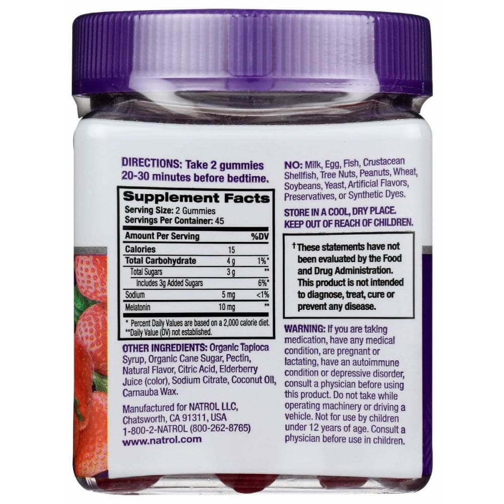 Fall asleep faster, stay asleep longer with great tasting, strawberry flavored Melatonin gummies.† Natrol® Melatonin Gummies are non-GMO, gelatin-free, and vegetarian.
