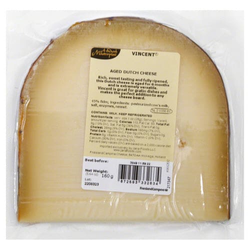 Rich, sweet-tasting, fully ripened Dutch Cheese matured for 6 months. Vincent releases pleasant characteristic bursts of flavor with every bite.