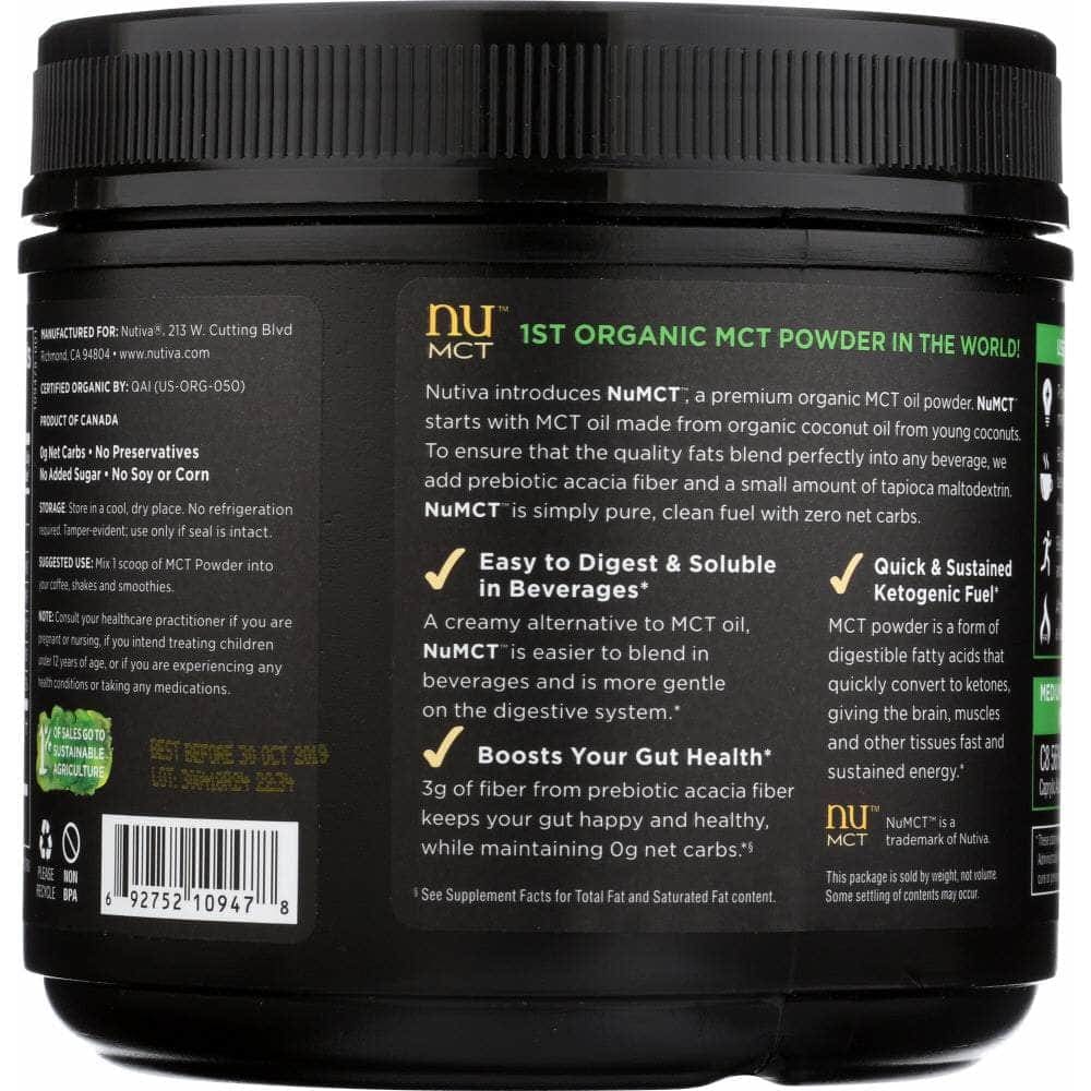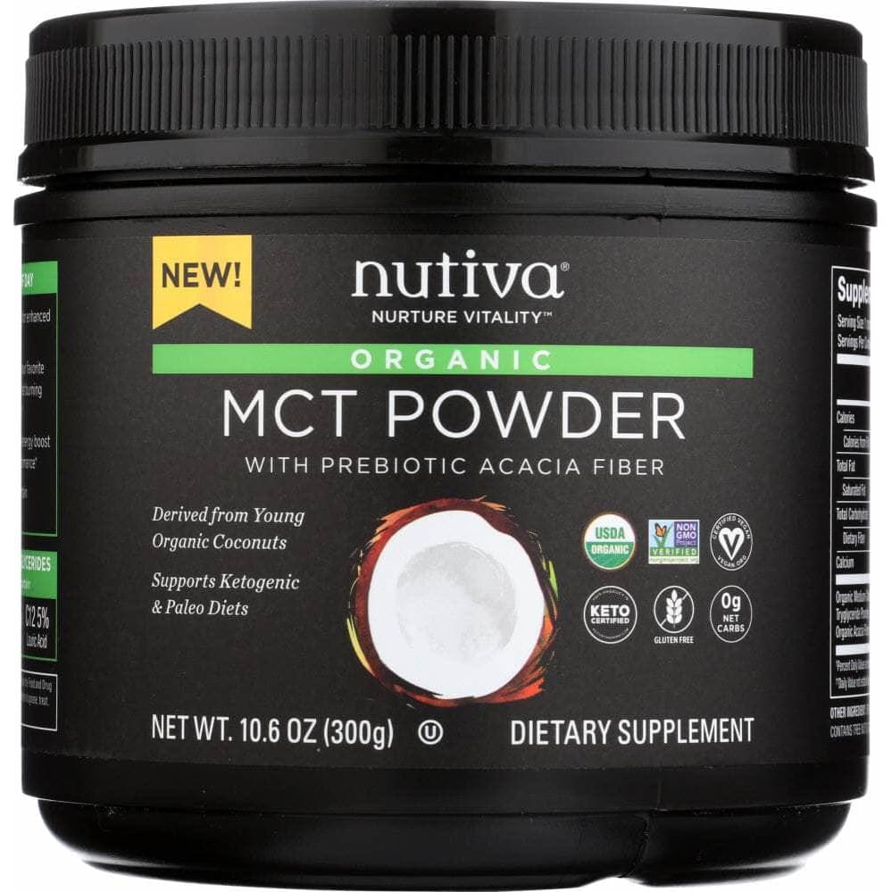 Introducing Nutiva Organic MCT Powder, NuMCT™ , a premium organic MCT powder. NuMCT™ starts with MCT oil made from 100% organic coconut oil from young coconuts. To ensure that the quality fats blend perfectly into any beverage, we add prebiotic acacia fiber and a small amount of tapioca maltodextrin. NuMCT™ is simply pure, clean fuel with zero net carbs.
