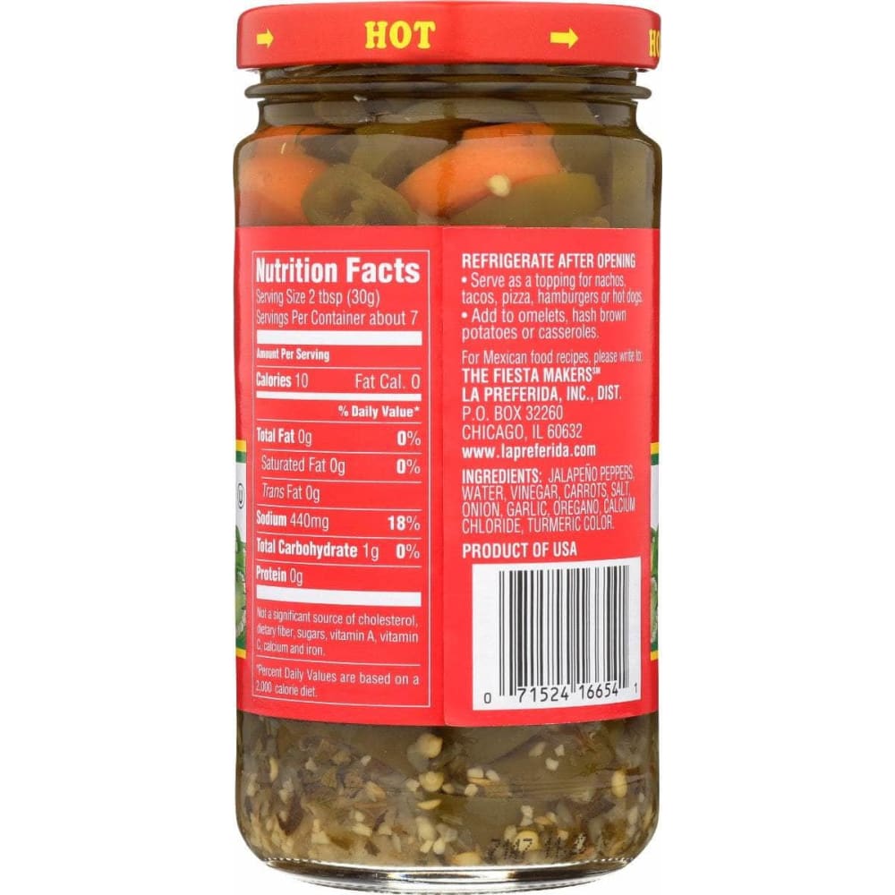 Jalapeño slices and crunchy carrots submerged in an enticing brine of vinegar, onion, garlic, and oregano. A delicious duo of pickled peppers and carrots makes an unbeatable topping for nachos, chili, pizza, sandwiches and more. A low-fat way to add depth of flavor to any dish. Don’t let the heat fool you, our jalapeño nacho slices are as addictive as they are spicy – VERY!
