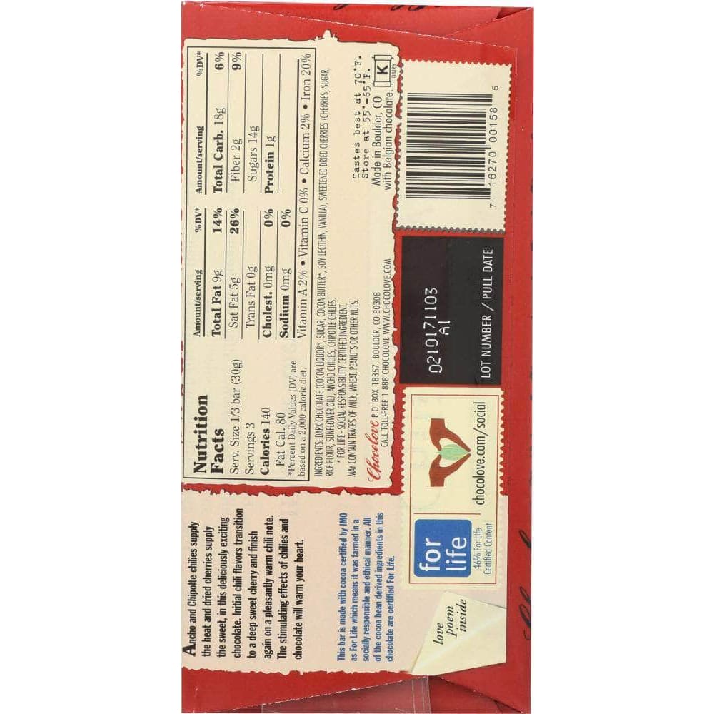 Dark semisweet chocolate with Ancho and Chipotle chilies and dried cherries