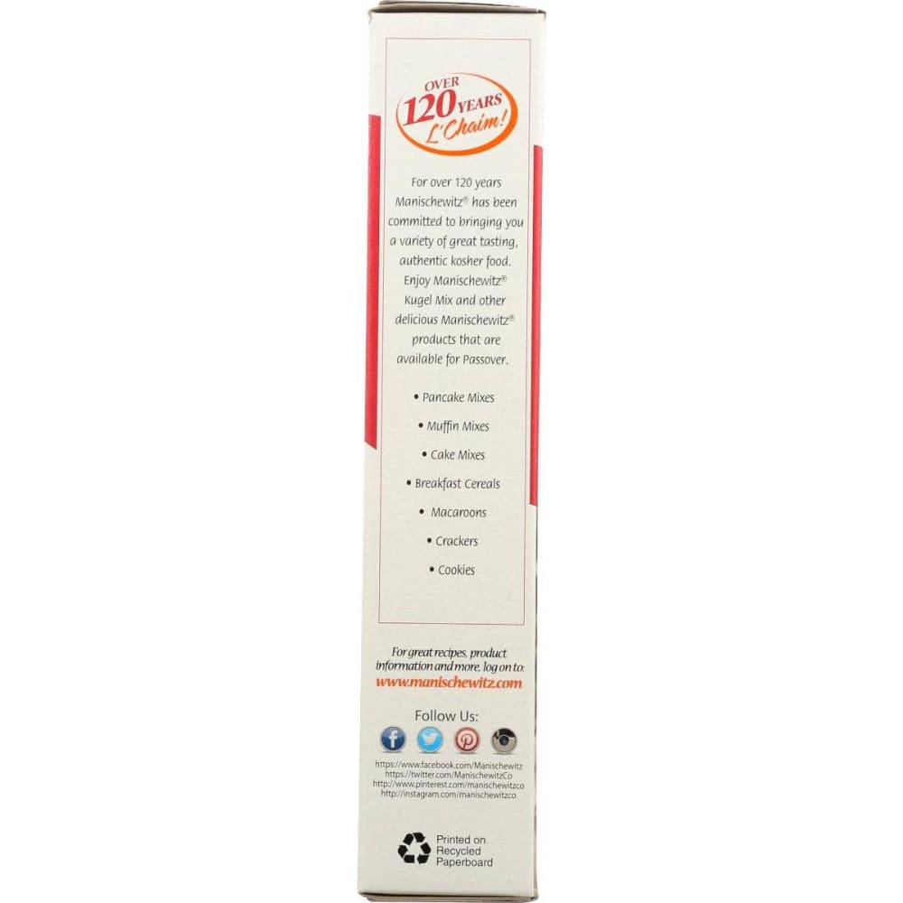 Kosher for Passover and all year round. Quality since 1888. Over 120 years. L'Chaim! Pan included. This product is sold by weight not by volume. Thanks to your support, we have become the leading provider of kosher food in America. We continue our commitment to deliver an assortment of food that meets the highest quality of kosher standards. For great recipes, product information and more, log on to www.manischewitz.com. Printed with soy ink. Printed on recycled paperboard. www.manischewitz.com. This product is lactose free & vegetarian. Product of USA.