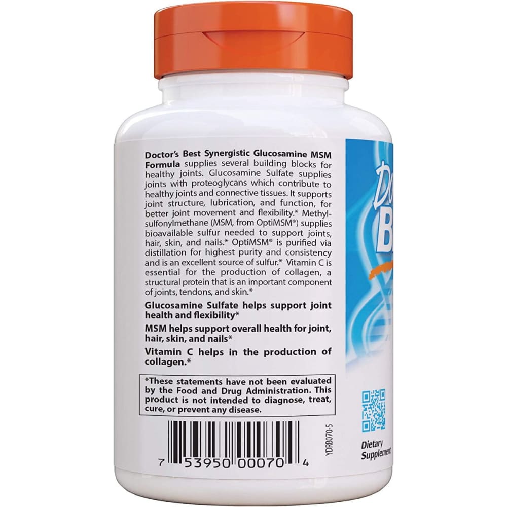 Doctor's Best Synergistic Glucosamine MSM Formula contains Glucosamine Sulfate and Methylsulfonylmethane (MSM, from OptiMSM®) to help support joint health. Glucosamine Sulfate helps support joint mobility. MSM supplies bioavailable sulfur needed to support joint health in addition to beauty benefits for hair, skin, and nails. Vitamin C is an ideal addition, to boost the body's own ability to produce and effectively use collagen, a structural protein that is an important component of joints, tendons, and skin. Vitamin C works synergistically with collagen for overall health of body functions and skin health.
