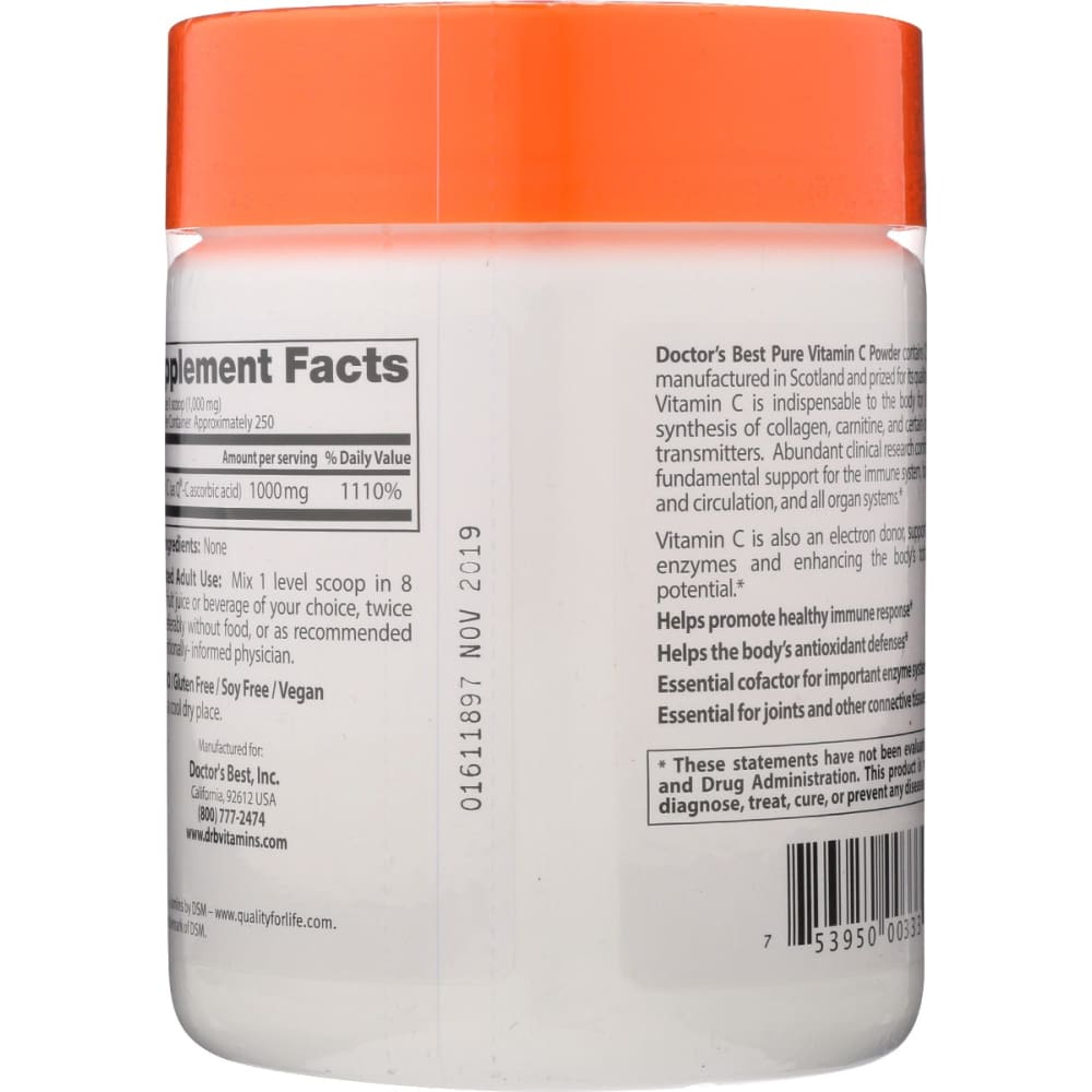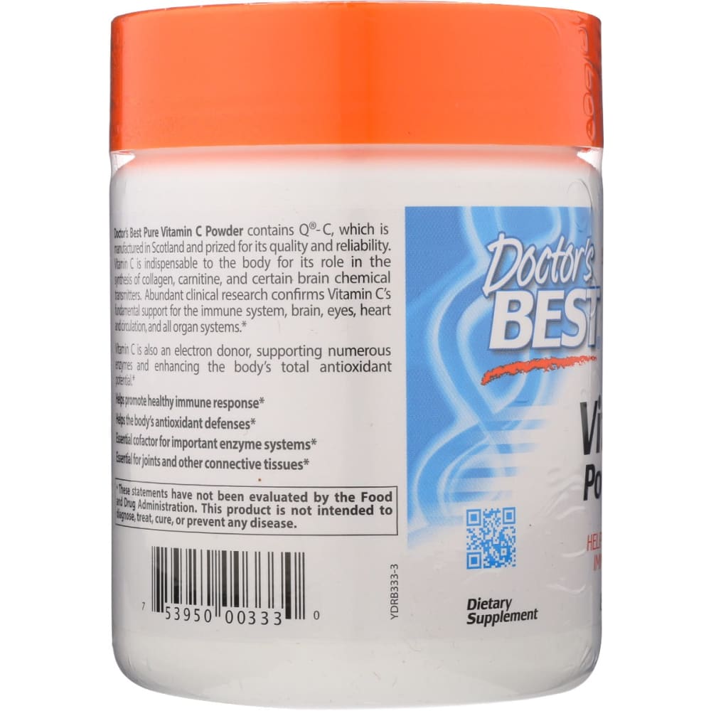 Doctor's Best Pure Vitamin C Powder contains Q®-C, which is manufactured in Scotland and prized for its quality and reliability. Vitamin C is indispensable to the body for its role in the synthesis of collagen, carnitine, and certain brain chemical transmitters. Abundant clinical research confirms Vitamin C's fundamental support for the immune system, brain, eyes, heart and circulation, and all organ systems.