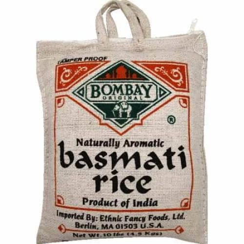 Bombay Original Basmati Rice from India has a nutty flavor with a firm texture and is grown in the fertile soil of the Himalayan region of India. This Bombay Rice is offered in an economical 10-lb size and comes in a durable burlap bag with a handle for your convenience. Cool clean mountain air, abundant streams and rainfall create the ideal growing conditions that give this premium Indian rice its special flavor and aroma. Bombay Original Basmati Rice from India is delicious in curry and other traditional Indian dishes and is also well-suited for most any recipe that calls for rice. This Indian rice is kosher, low in calories, contains no fat, no sodium and no cholesterol for your health.