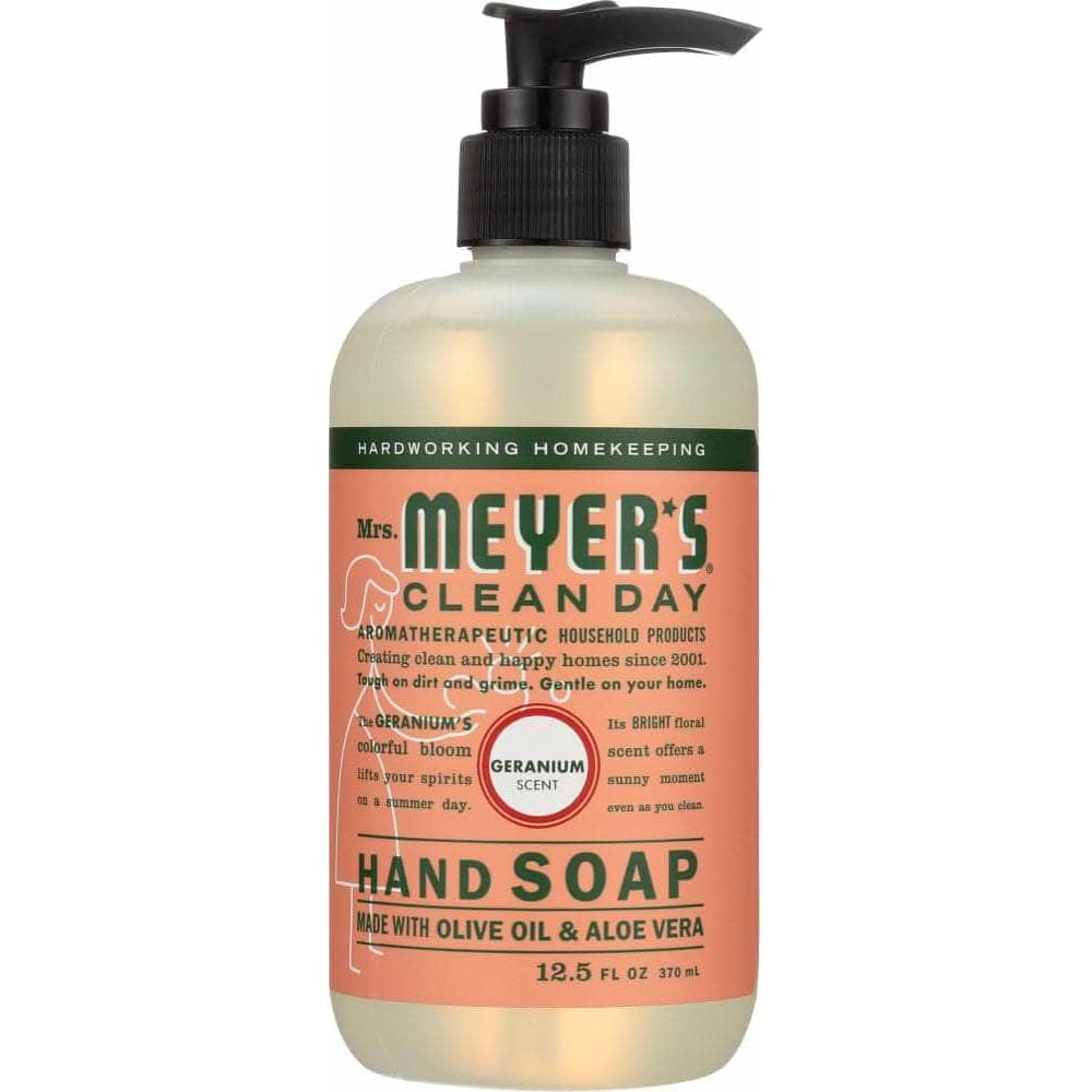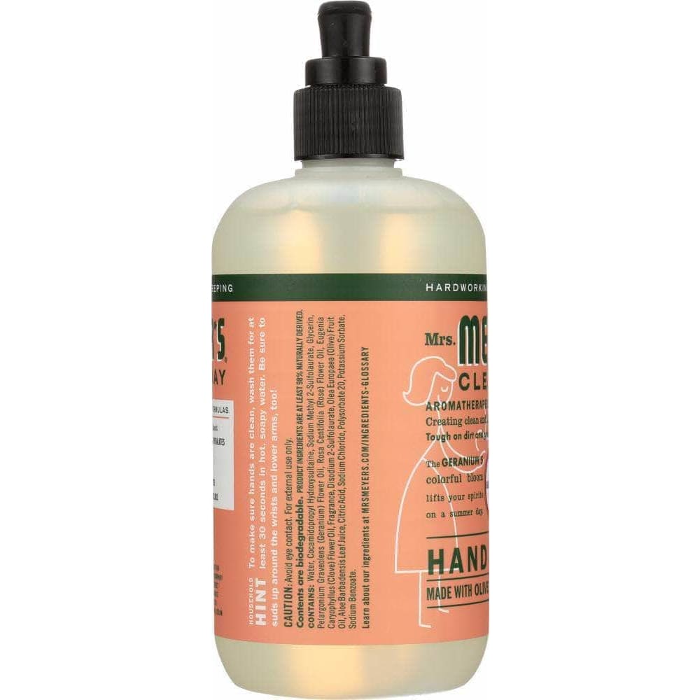 Mrs. Meyer's Clean Day Geranium Hand Soap contains a special recipe of aloe vera gel, olive oil and a unique blend of essential oils to create a hard working, non-drying, yet softening cleaner for busy hands. Hands have never had it so good. Paraben free. Made in the USA.