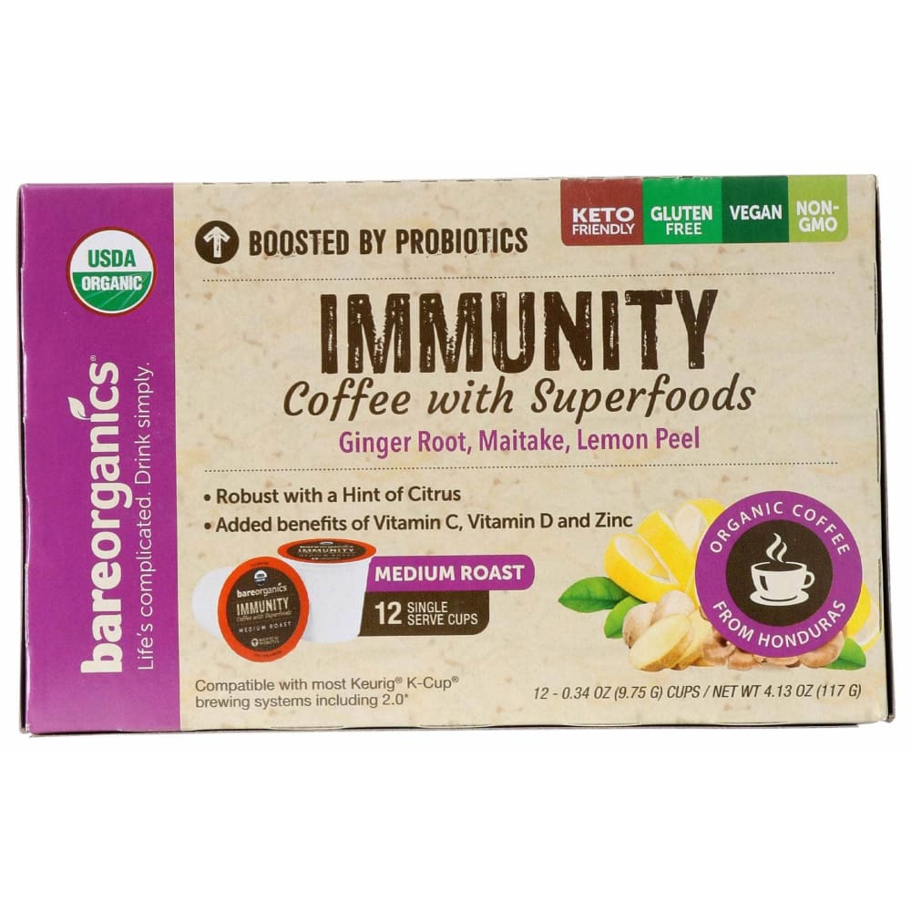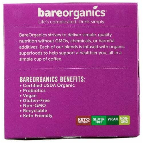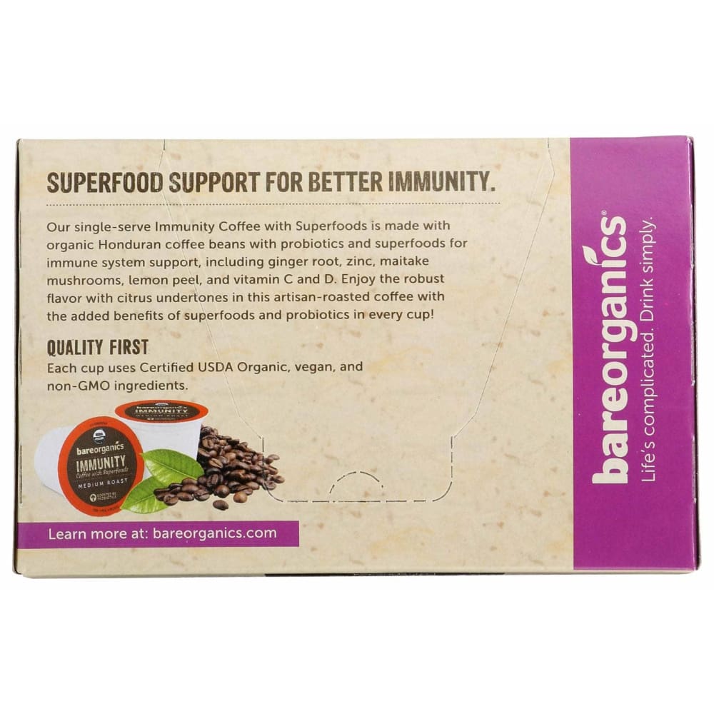 BareOrganics single-serve Immunity Coffee with Superfoods is made with organic Honduran coffee beans with probiotics and superfoods for immune system support, including ginger root, zinc, maitake mushrooms, lemon peel, and vitamin C and D.+ Enjoy the robust flavor with citrus undertones in this artisan-roasted coffee with the added benefits of superfoods and probiotics in every cup! BareOrganics Immunity Coffee is developed without harsh chemicals or ingredients, and is proudly USDA Organic, Non-GMO and Gluten-Free. Compatible with most single serve and Keurig® K-Cup® brewing systems, including 2.0.* *BareOrganics is not affiliated with Keurig Inc. "Keurig®" and "K-Cup®" are registered trademarks of Keurig Inc.