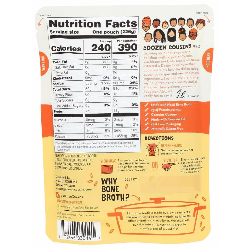 This flavorful rice is cooked using real chicken bone broth instead of water so that each serving contains 7g of collagen-rich protein. Our Spanish Yellow Rice is fully cooked and seasoned with onions, roasted garlic, turmeric and spices, so all you have to do is warm it in the microwave or on the stovetop and enjoy!Β From Virginia to Venezuela there are few foods loved more universally than a well-seasoned pot of rice. To keep that love alive, we slow simmer all of our recipes using real, wholesome ingredients and season them according to traditional recipes.