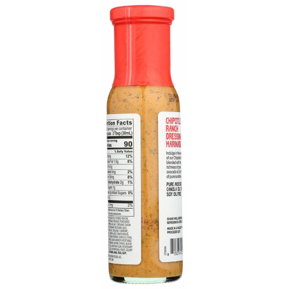 Chosen Foods Chipotle Ranch Dressing is irresistibly creamy, spicy, and tangy. With real buttermilk, chipotle peppers, lemon juice, and a dash of salt in a base of pure avocado oil, this delicious blend transforms the way you think about ranch. Healthy, gluten-free, canola free, vegetarian, and certified by the Non-GMO Project.
