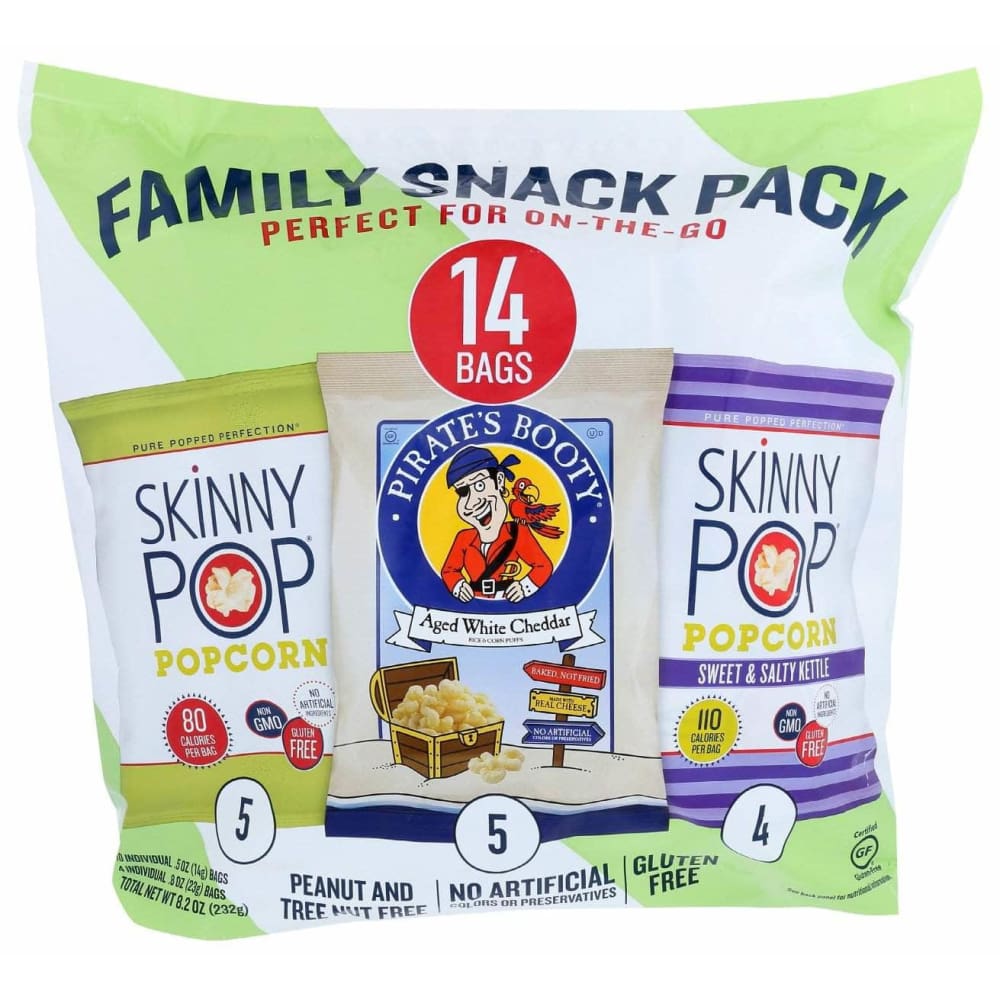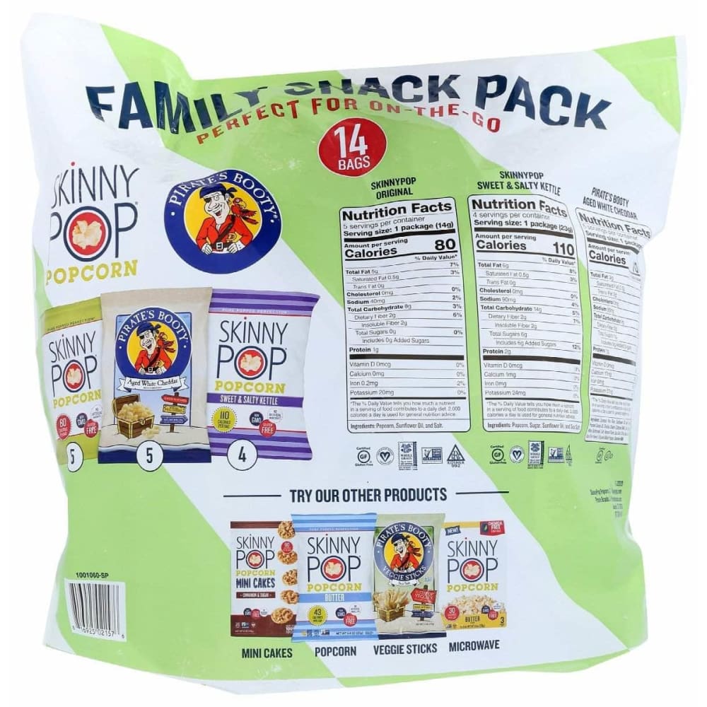 Combining two family favorite healthy snacks SkinnyPop and Pirate's Booty. SkinnyPop always starts with a premium popcorn kernel, sunflower oil and the perfect amount of salt. From there, pure popped perfection says it all. Our popcorn has no GMOs, gluten or preservatives, making skinny a tasty, guilt-free snack. Pirate’s Booty aged white cheddar puffs is a perfect to add to your child's lunch as they Set Sail for school, or as an afternoon snack to fuel activities, our baked puffs aim to conquer any snacking occasion. With gluten-free rice and corn blended with real aged white cheddar and baked to perfection, you’ll quickly discover that the true Pirate’s treasure is in the palm of your hands.