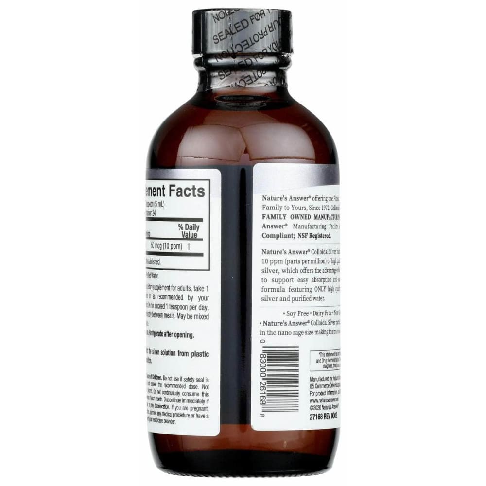 Nature's Answer offering the Finest Supplements from our family to yours, since 1972. Colloidal silver produced in our FAMILY OWNED MANUFACTURING FACILITY. Nature's Answer Colloidal Silver features a concentration of 10 ppm (parts per million) of high quality elemental colloidal silver, which offers the advantage of ultra small particle size to support easy absorption and excretion. Pure, clean formula featuring only high quality elemental colloidal silver and purified water.