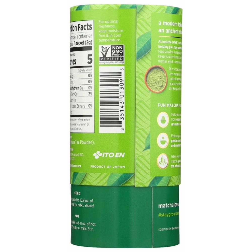 Bring the 100% Japanese matcha––superior quality––on the go in these single serve sticks. No matter where the day goes, stay grounded by taking your tea ritual with you.Each box contains 15 single-serve finely milled Japanese matcha stick, no added sugar or any kind of sweetener.Perfect for preparing both hot or cold matcha.