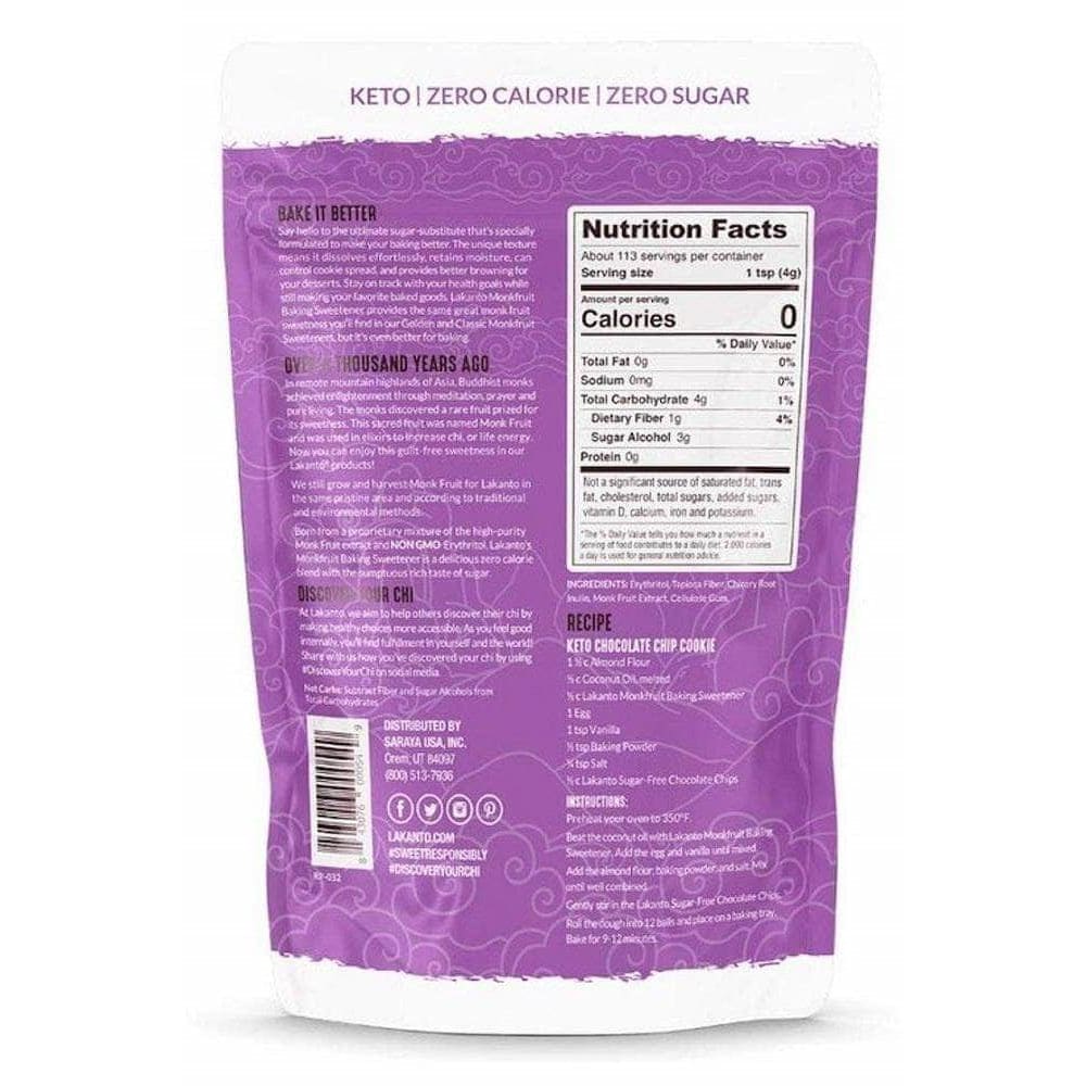 Say hello to the ultimate sugar-substitute—specially formulated to make your baking better. The unique texture means it dissolves effortlessly, retains moisture, can control cookie spread, and provides better browning for your desserts. Stay on track with your health goals while still making your favorite baked goods.Lakanto Monkfruit Baking Sweetener provides the same great taste and sweetness you’ll find in our Golden and Classic Monkfruit Sweeteners, but it’s even better for baking.BETTER FOR BAKING: Lakanto Baking Sweetener dissolves effortlessly, retains moisture, can control cookie spread, and provides better browning for your desserts.TASTES JUST LIKE SUGAR: Contains zero net carbs and zero calories. Perfect for baking cookies, cakes, and other sweet, sugar-free treats.1:1 SUGAR REPLACEMENT: Lakanto Baking Sweetener matches the sweetness of sugar, helping you fill your kitchen with a healthy cup-for-cup alternative to ordinary baking and cooking ingredients.LIFESTYLE FRIENDLY: Works with ketogenic, diabetic, candida, paleo, vegan, low-carb, low-sugar, non-GMO, and all-natural diets.INGREDIENTS: The perfect mix of monk fruit extract and erythritol with tapioca fiber, chicory root inulin, and cellulose gum to bring your baking to a whole new level.NO RISK: Don't love it? We offer a no-risk guarantee and will happily refund your purchase!