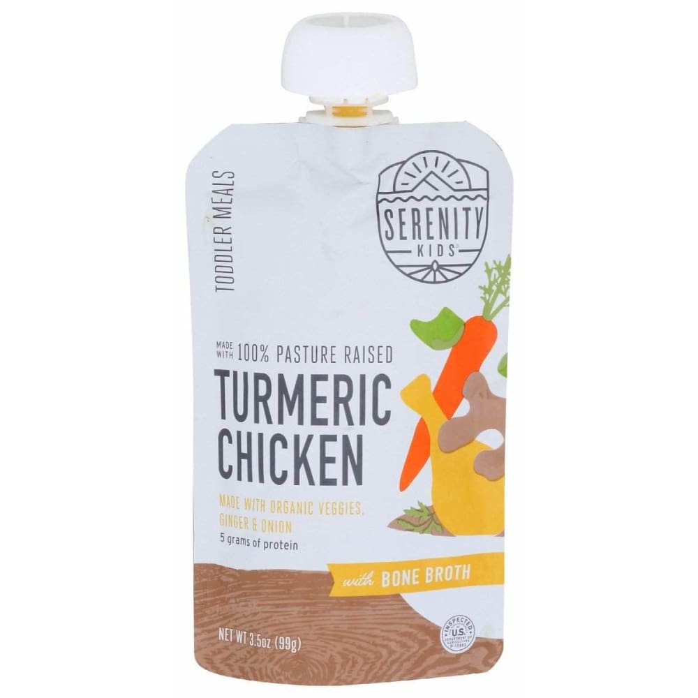 Our delicious Turmeric Chicken is made with organic free range chicken bone broth, pasture raised chicken from small American regenerative family farms, organic vegetables, and earthy herbs like turmeric and ginger. These nutrient-packed toddler purees are a great source of vitamins, antioxidants, and minerals, that helps your growing little one learn to enjoy complex flavors and sets them up for healthier eating. Why bone broth? Bone broth is rich in easily digestible protein and amino acids. With the addition of the anti-inflammatory herbs, our Turmeric Chicken can help broaden toddler’s palate, strengthen growing bones and teeth, help build connective tissue and joints, reduce the risk of food sensitivity, and support immunity and digestion. With no added sugars or preservatives, our allergen-free, easy grab and go pouch is the most nutritious low sugar toddler food option for your little one. Make your kid a Serenity Kid!