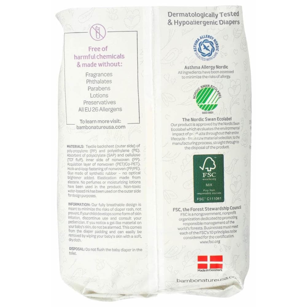 Bambo Nature Dream disposable diapers are more than just eco-friendly— they are the first baby diapers certified with the Nordic Swan Ecolabel, and now the fluff pulp is made TCF (totally chlorine-free). As always, they are free of harmful chemicals and all known allergens. Our diapers have a unique three-layer design and super-absorbent core that can stand up to multiple wettings—even overnight. Combined with our fully breathable backsheet, baby's sensitive skin will stay dry and comfortable.