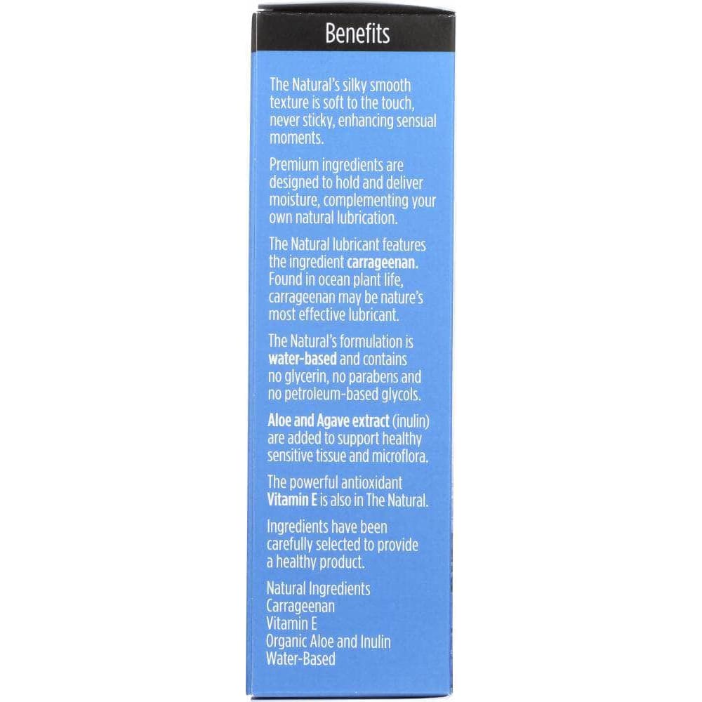 The primary ingredient in The Natural personal lubricant is carrageenan, an extract from rich marine algae with amazing potential health benefits. This abundantly renewable ingredient has extraordinary thickening abilities with other forms of it used in everything from food to cosmetic products.