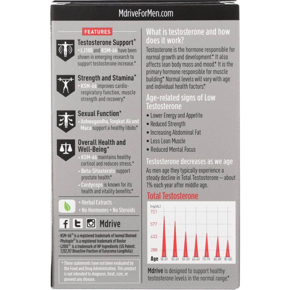 Mdrive contains powerful extracts from KSM-66 Ashwagandha and Cordyceps Mushroom to strengthen the adrenal glands and provide "fuel" for the body to build on. Mdrive’s synergistic blend also contains botanical extracts from Tongkat Ali, Maca (root), American Ginseng (root), and Phytopin to further support sustained energy, strength, stamina, endurance and drive.