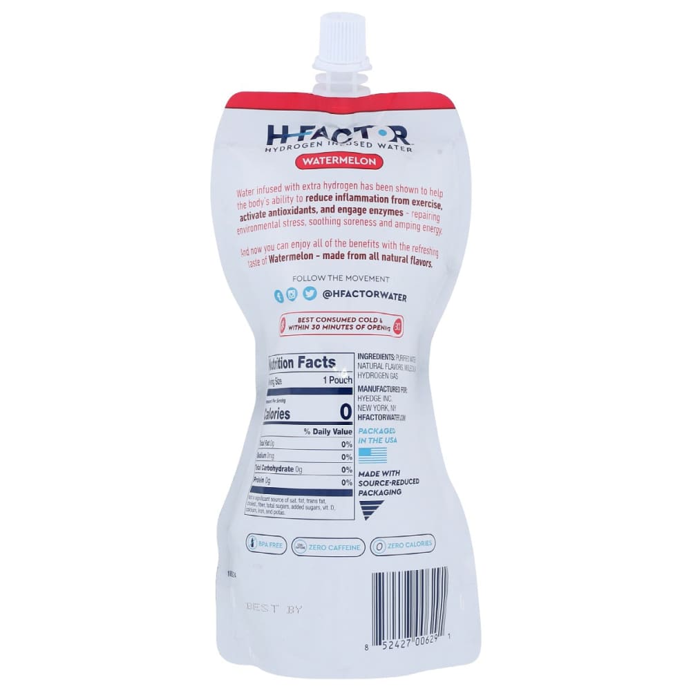 HFACTORWATER Watermelon is water infused with pure hydrogen and contains only three ingredients: pure water, pure hydrogen and all natural flavors – zero calories and no sugar! The best part is that Hydrogen Infused Water has been shown to provide therapeutic benefits for fitness, health and lifestyle recovery and wellness.