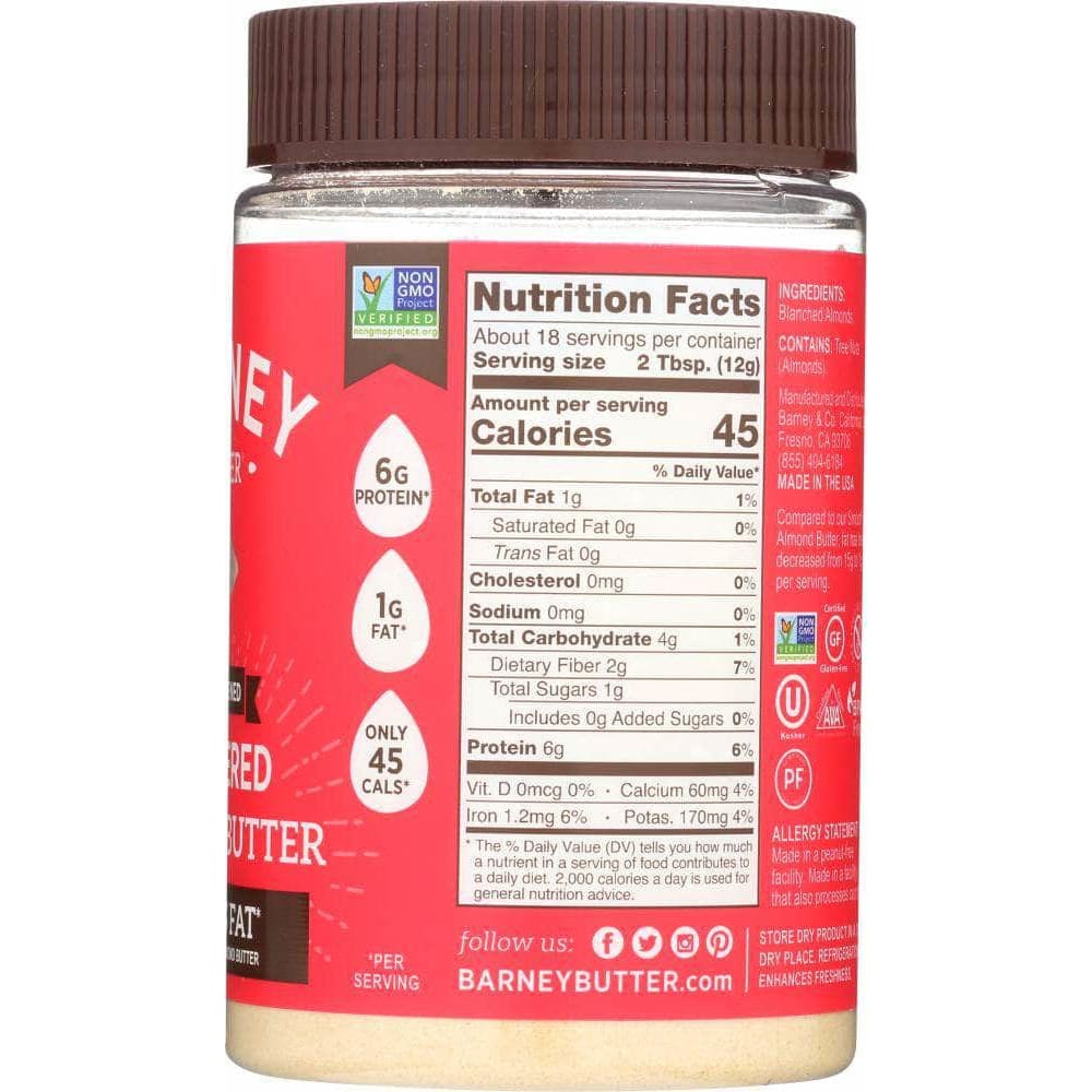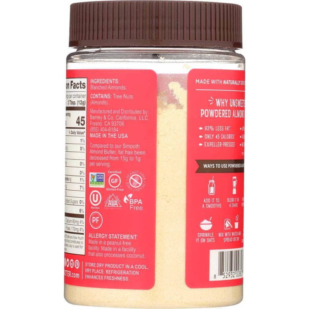 Barney Unsweetened Powdered Almond Butter is a healthier, better for you protein boost! Our 100% natural + Non-GMO verified powdered almond butter provides an incremental option for almond butter addicts who love the good fats in almond butter but are in search of an additional protein punch with less fat, calories and carb count.